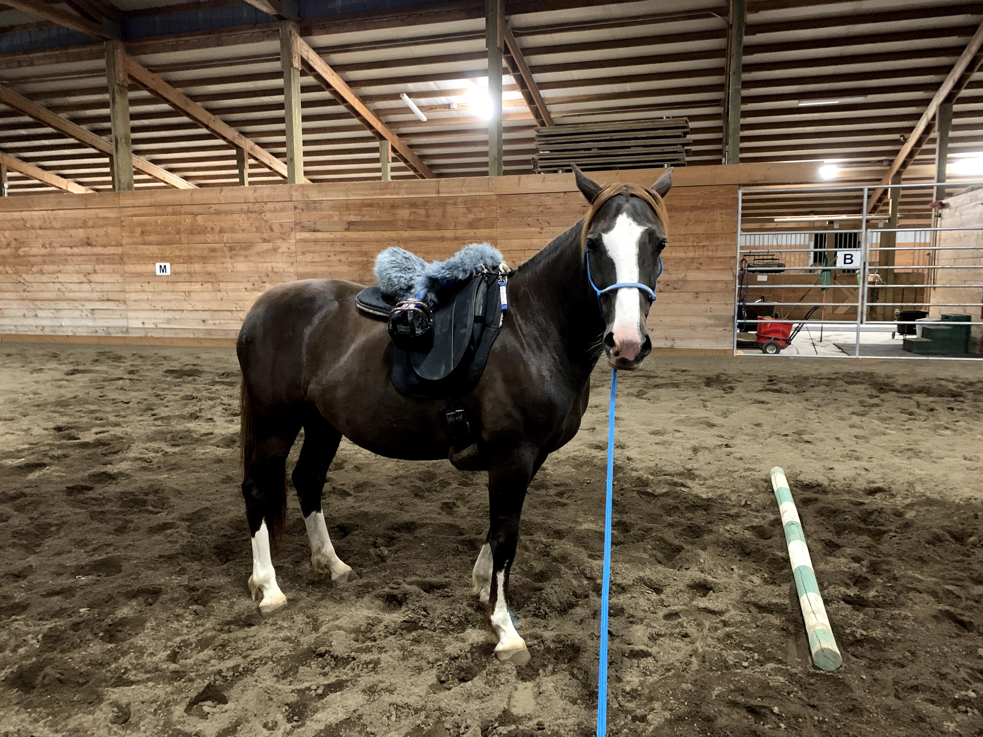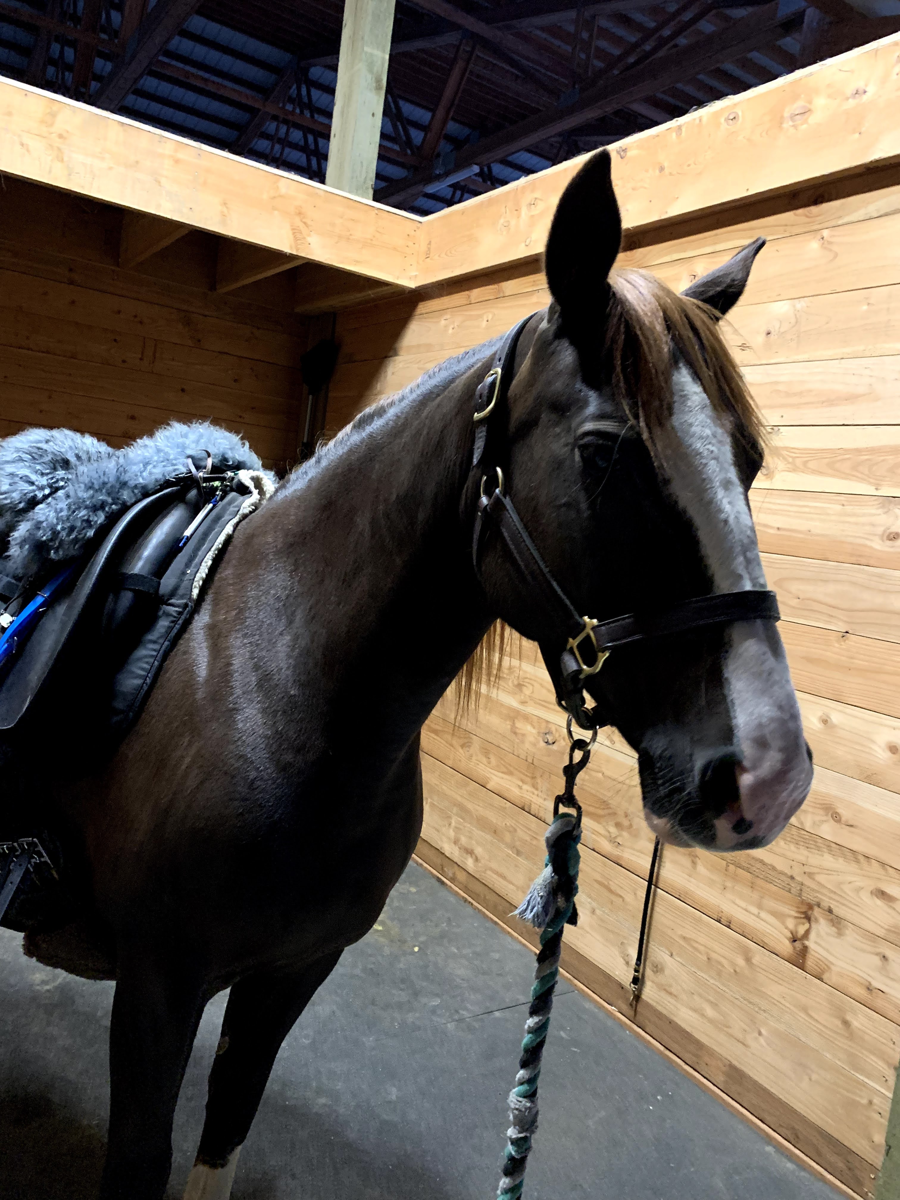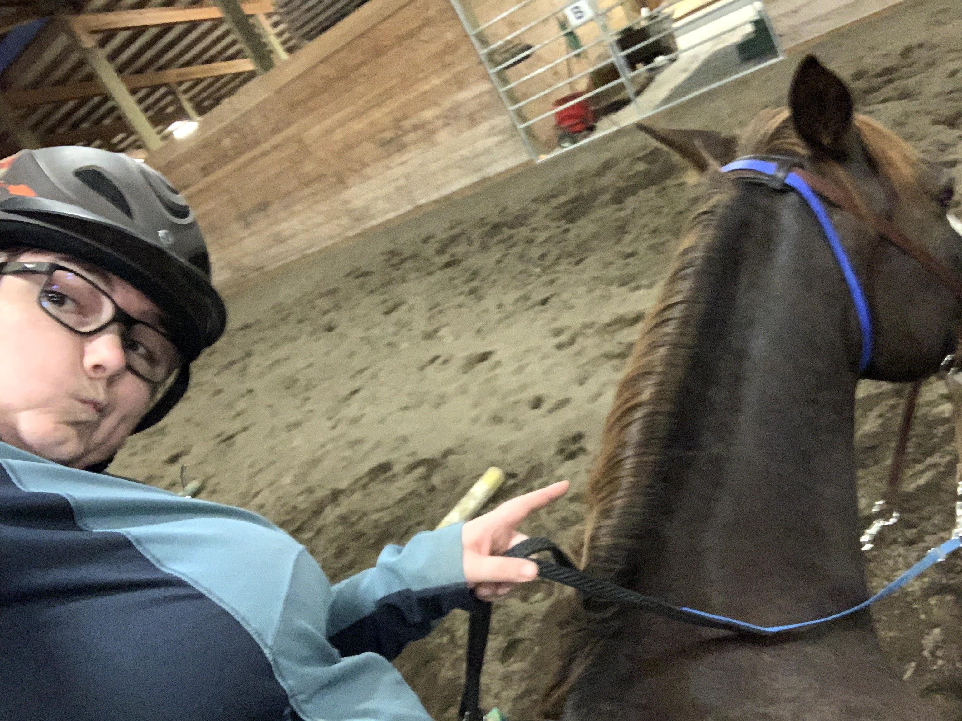 But boy, did it set some expectations for last night! I got to the barn a bit later than normal, with a vague thought to maybe, possibly ride my horse. I’ve put up a mental block lately, thinking “If I’m going to ride in the arena, I should ride in the beautiful bareback pad I purchased, as it’s good for my seat and a solid workout and the arena is a safe place to do so.” This has had the unintended effect of me avoiding riding in the arena at all, as my seat and fitness are just kind of soft and sad and not where they need to be. Instead I tacked her up in our Wintec saddle, and she was chill, standing ground tied and lipping at Kade’s hair, no stress at all. I’ve switched to ground tying from the cross ties based partly on needing to train her to ground tie, and also I’ve noticed she’s much more comfortable and able to relax a bit more not cross tied. I still do both as I believe all horses need to tie in a variety of situations, but we’re still working on relaxing together as much as possible right now.