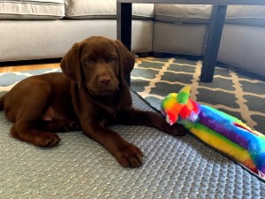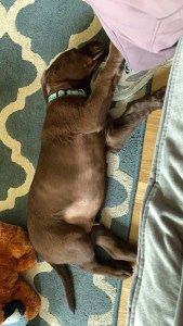 Normally, after I’ve been working on a blog post for over a week, something mostly coherent and possibly pithy will be produced. After a week with no stretch of sleep lasting more than five hours, this attempt is heavier on the photos than the words. Everyone, meet Bernard (nicknames so far include: Benny, Bernie, BB, Benny Mac, Pupparoni, Baby Shark). He’s a two month old AKC Chocolate Labrador Retriever, from Jem Farms, out of a Merganser’s stud dog Saint Brees SH (related to Becky Bean’s amazing Artemis). In fact, this dog is mostly Becky’s fault, despite us not having seen each other in person for…way, way, way too long. Her descriptions of Artemis and knowing how well she fits their family, coupled with my desire for an adventure dog, led me to a Lab. I loved Cyrus and he was usually pretty good about coming along but I always left him behind for longer rides or hotter days.
