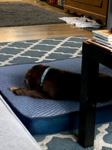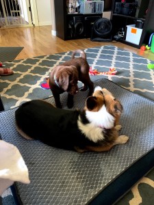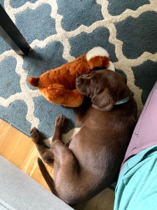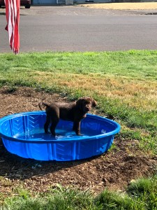 So far, Benny has led to a lack of sleep among the household (though we’re all taking shifts). He’s chewed on Tom’s beard, the computer chairs, and the sprinklers. He protests at not being allowed on the couch, has the same manic play just before collapse phase of a toddler, and has pretty much taken to kennel training (at least at night) like a champ. He’s deeply in love with the kiddie pool (Labs are water dogs, who knew?) and the headache inducing rubber chicken.