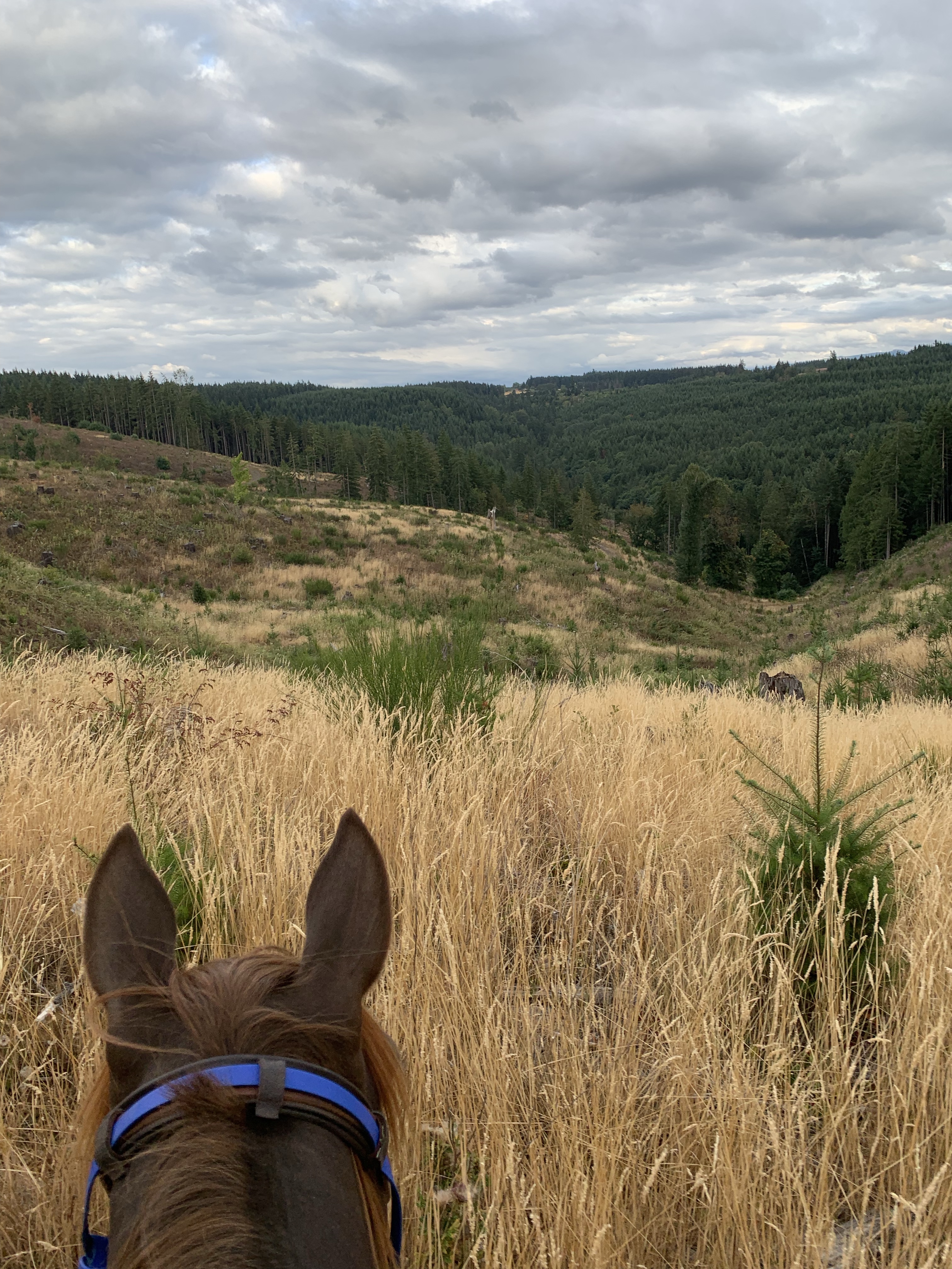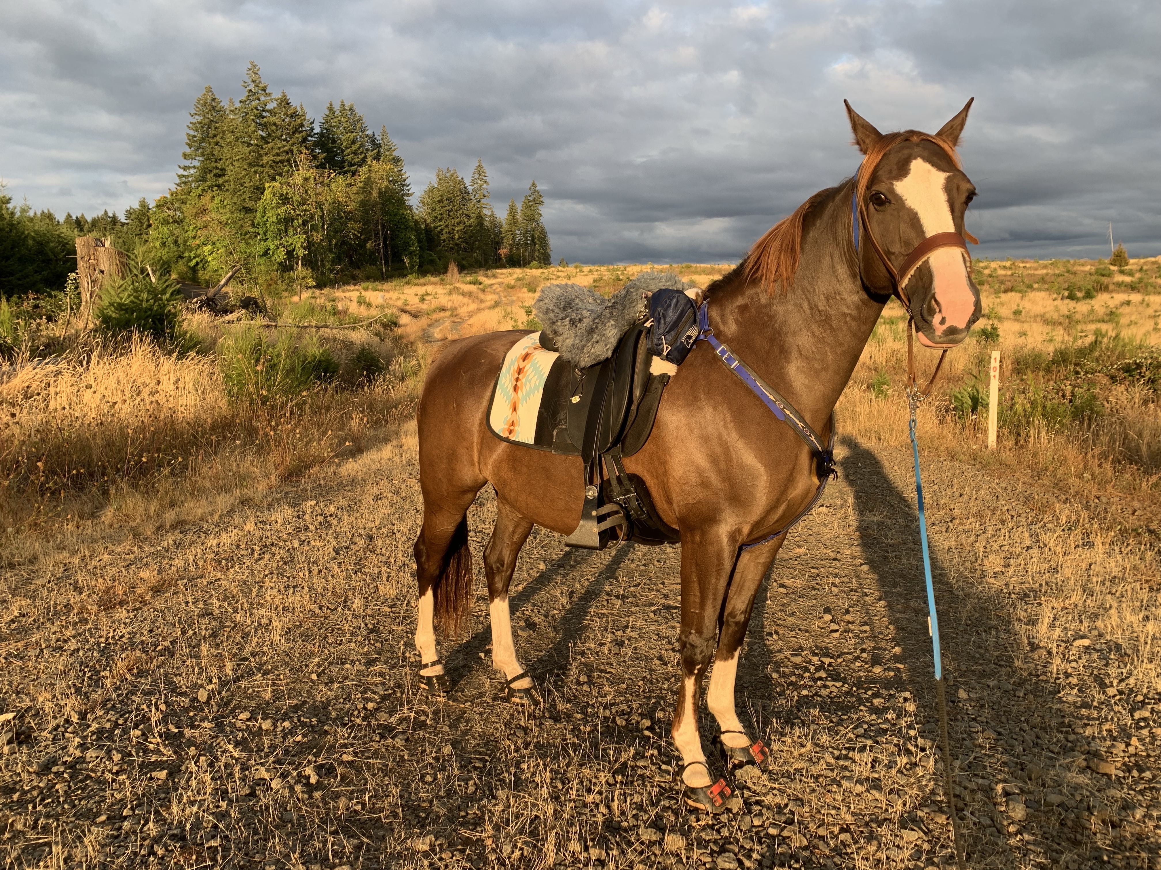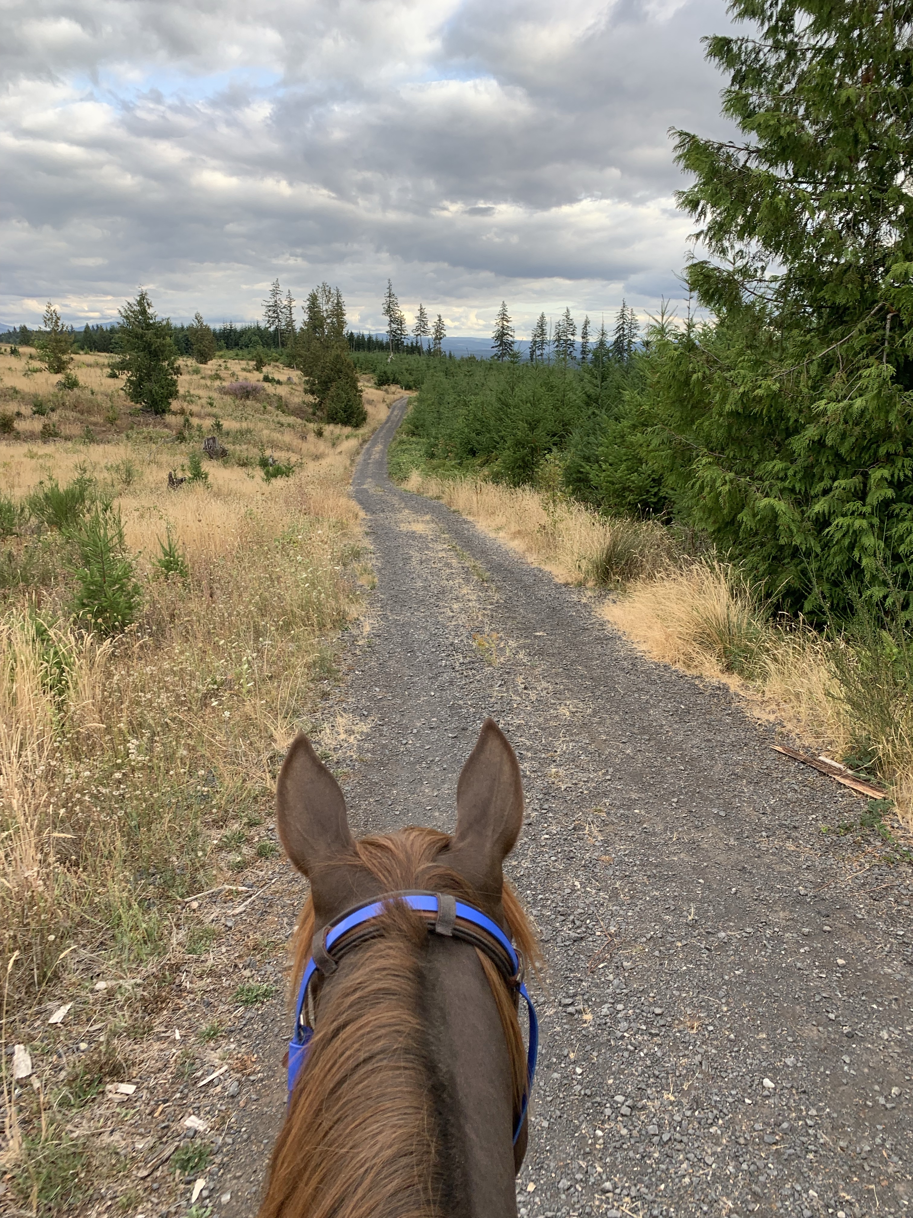 The husband is home from his vacation now, so I seized the remaining day light, left him to watch the kid not watching the puppy, shoved Tarma’s boots on (Scoots on all four now) and squeezed in a short ride. We’re lucky to have private timberlands to ride on with volunteer maintained trails a short haul from the barn.