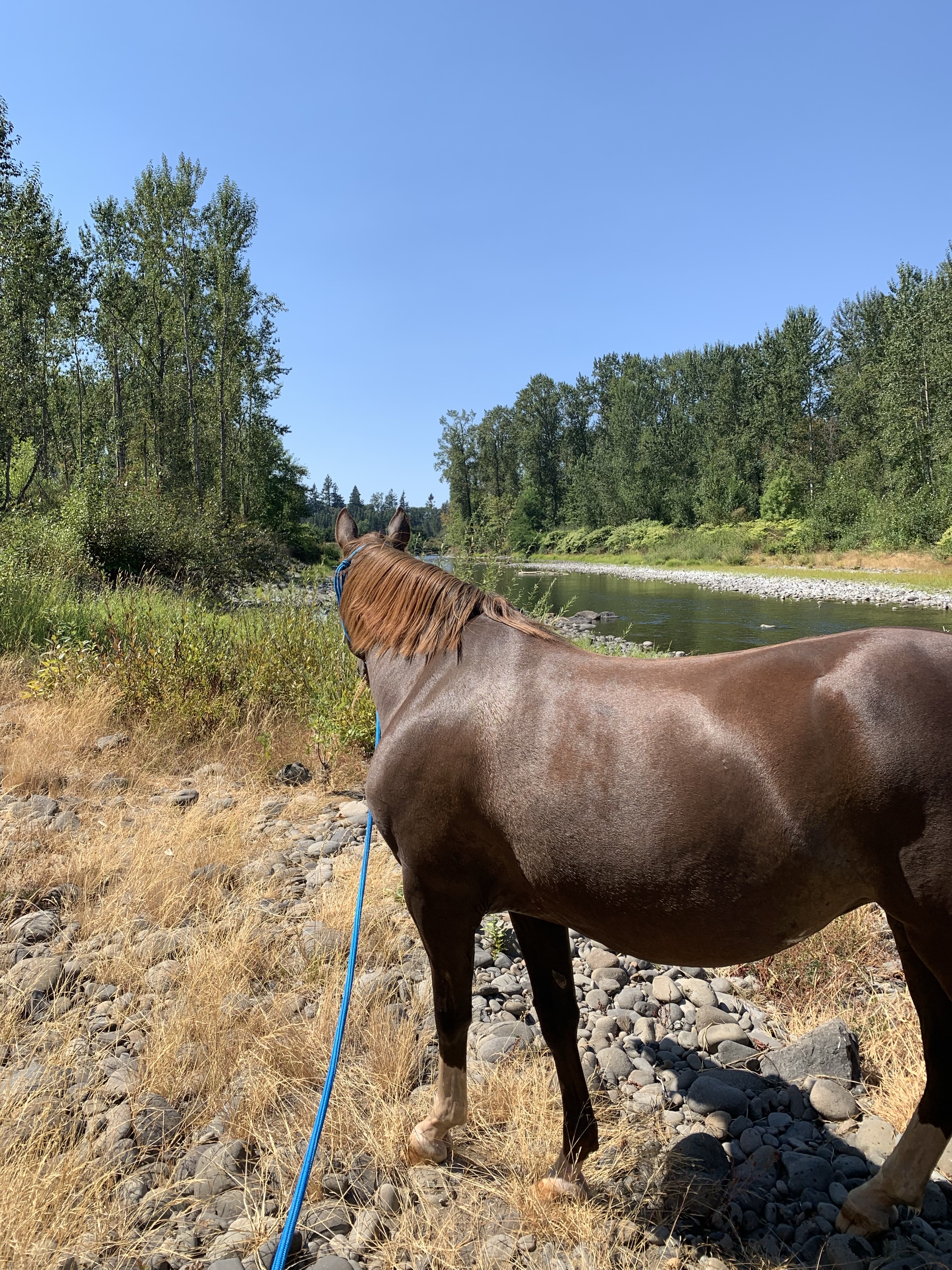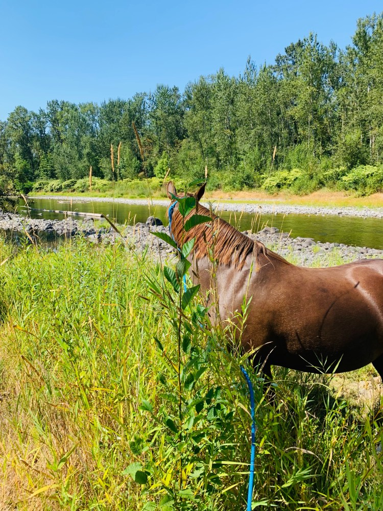 Today I was hoping to ride solo at Hardy Creek, but I never even got her boots on. She was nervous in the pasture, she let me walk up and halter her at least. Instead of putting her boots on I decided to let her lunge a bit, see if she would relax. An hour later, both on the line and off, and she was still just as worked up and unwilling to relax. We ended up in her stall just trying to breathe. I phoned a friend and she agreed that even if Tarma did settle down, I shouldn’t ride today, so I let that go. Once she did relax in the stall, eating and drinking and standing still, we took a stroll down to the river, where she totally did a 180 attitude wise. Her head came down, she sighed and swallowed and walked out easily, clearly saying “Well why didn’t you start with this? This I’m happy with!” We grazed by the river (blackberry season, yum!) and enjoyed the sound of the river together, relaxed and calm at last.