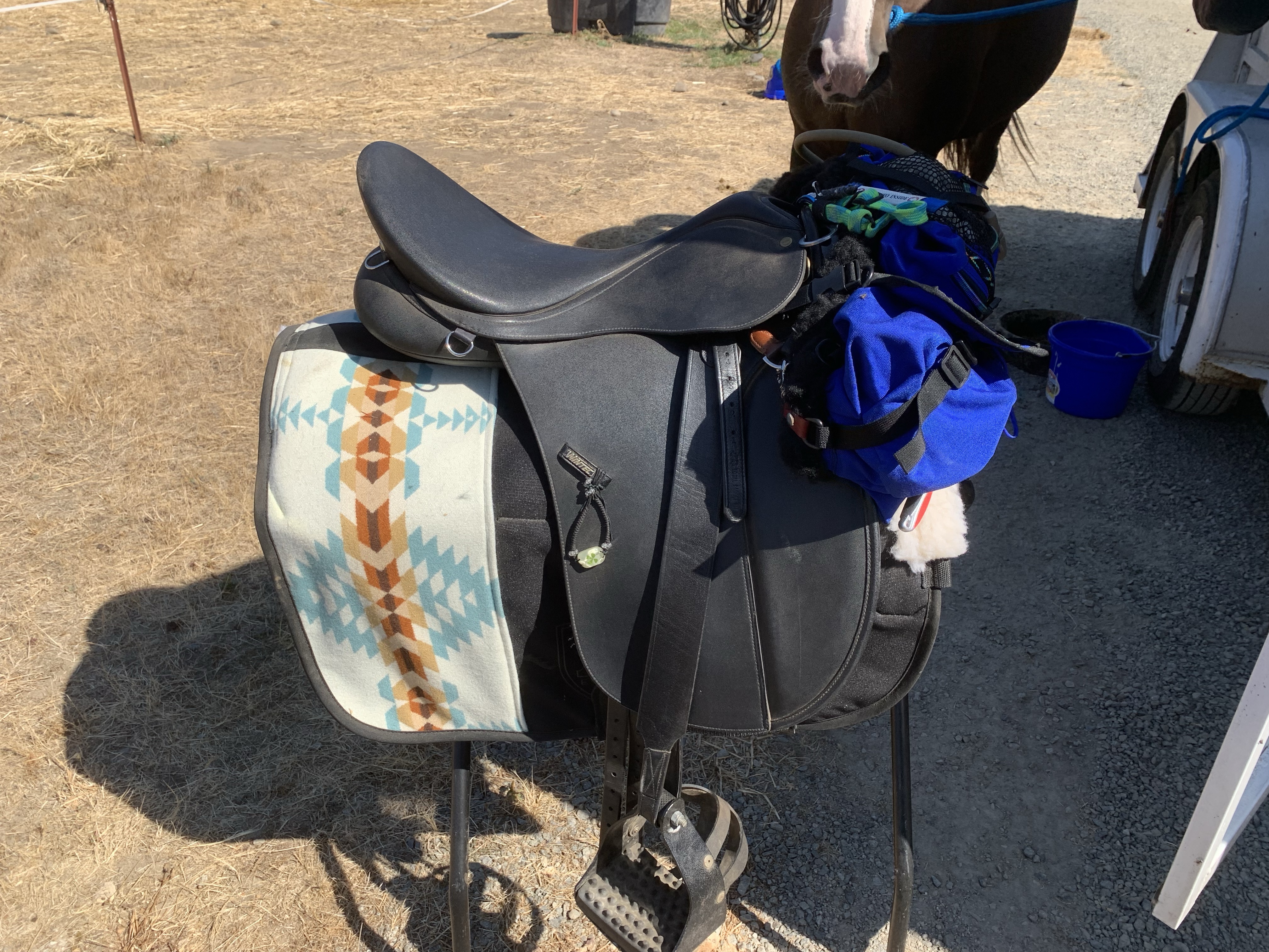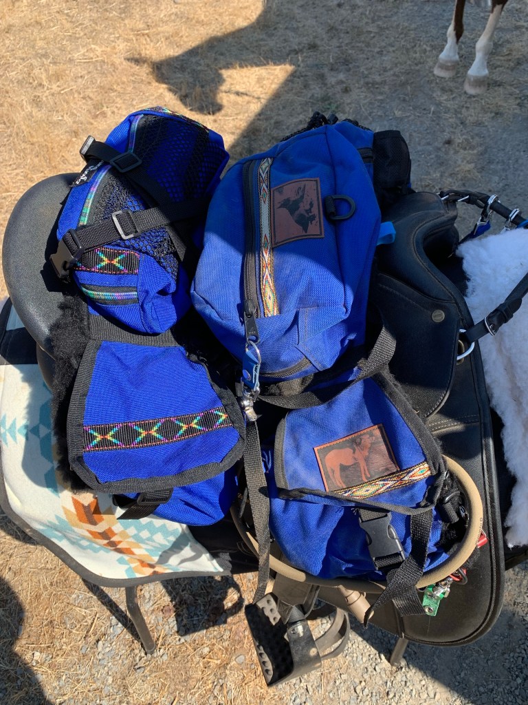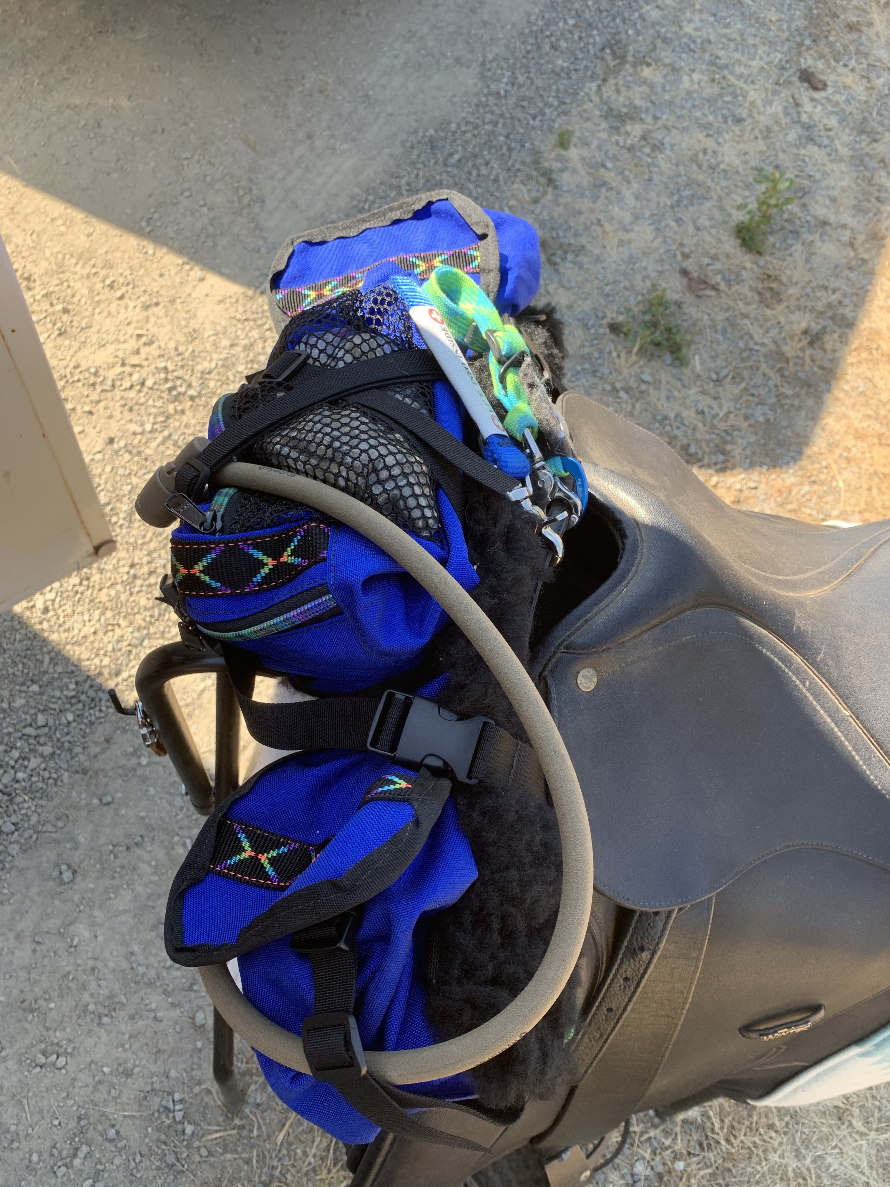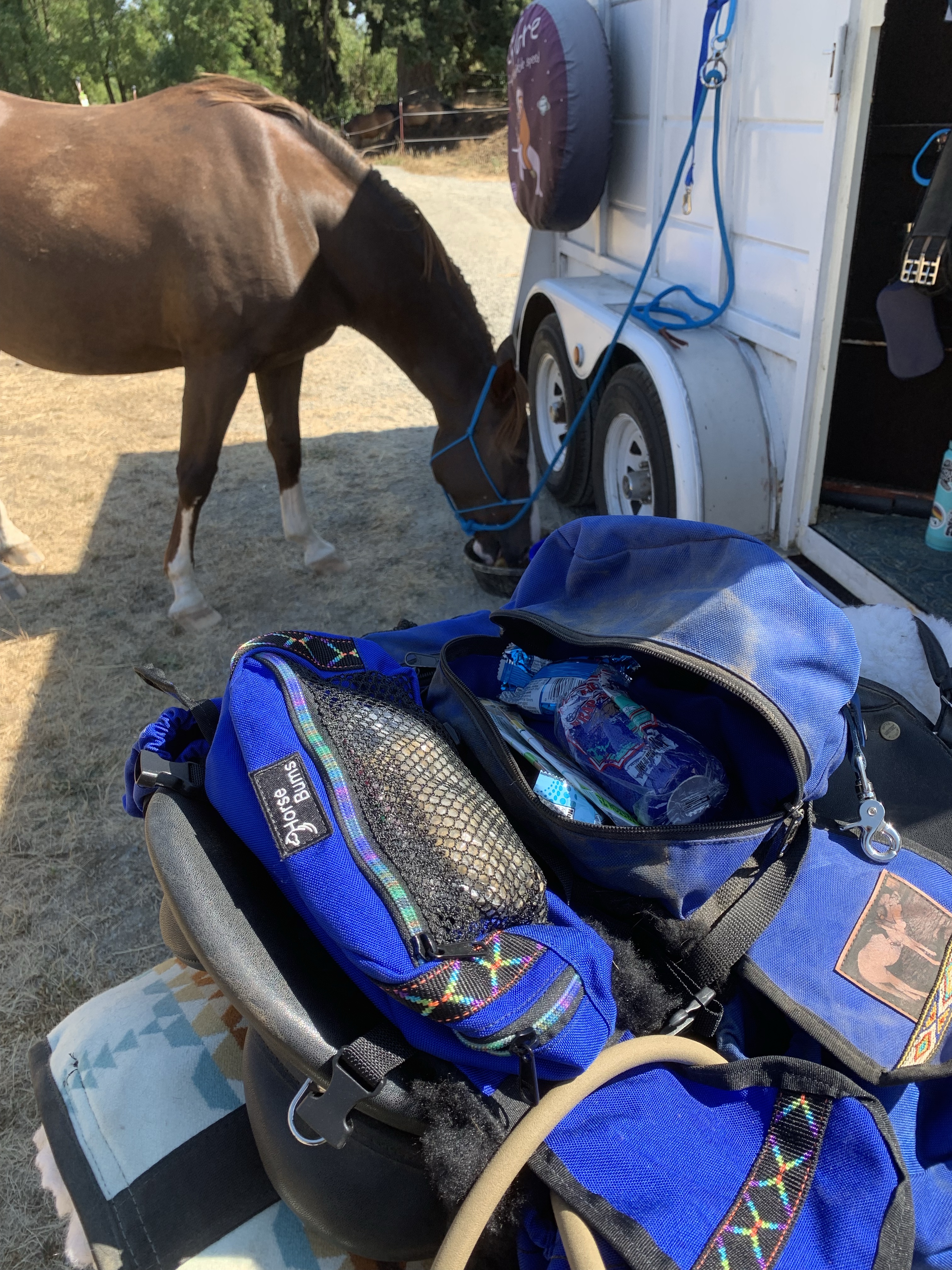 Just to make sure she was still willing to hang and relax with me, I tied her to the trailer (I had it all hooked up anyway) and she ate her beet pulp mash while I futzed with my new Horse Bums bags. She also stole my apple I had brought for lunch while I cleaned out all the buckets for our trip next week, just stuck her head in the tack area and snagged it out of the trailer.