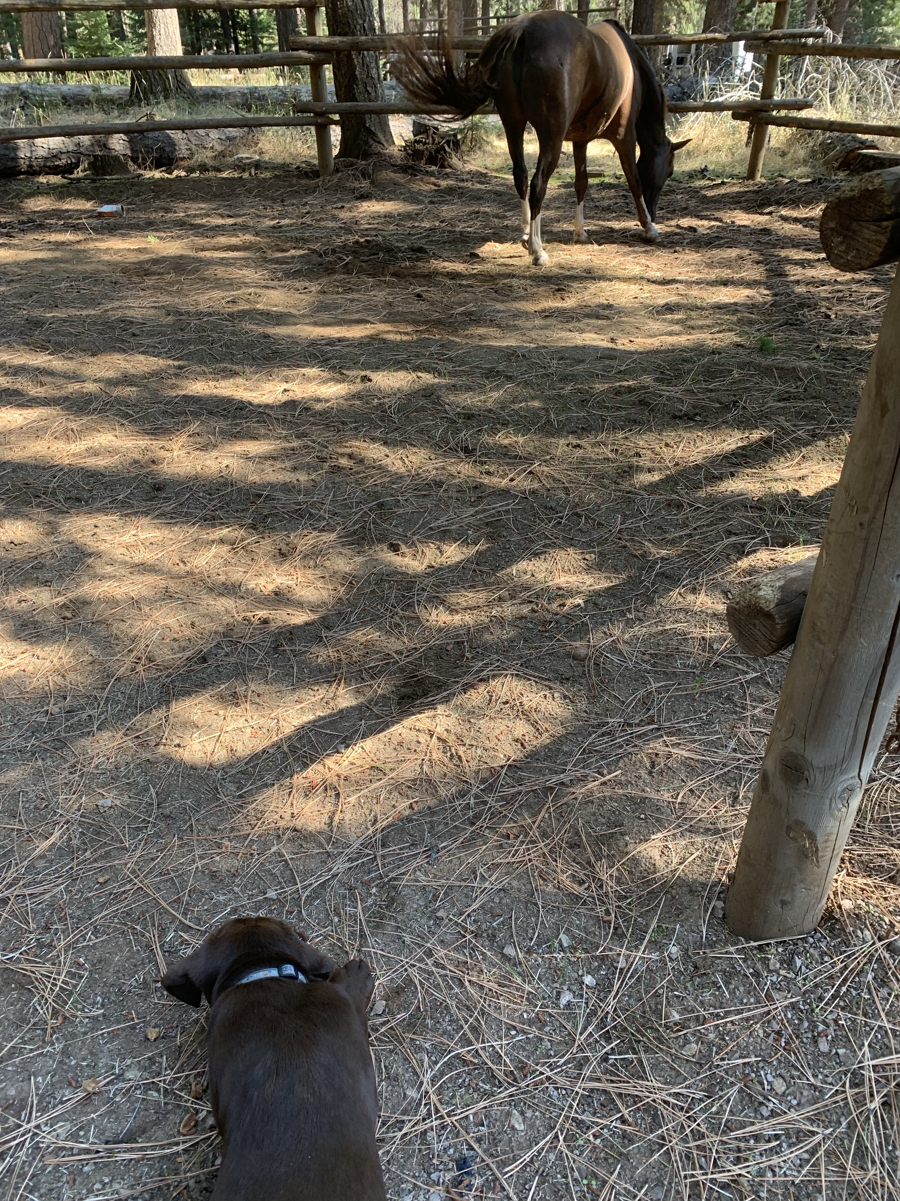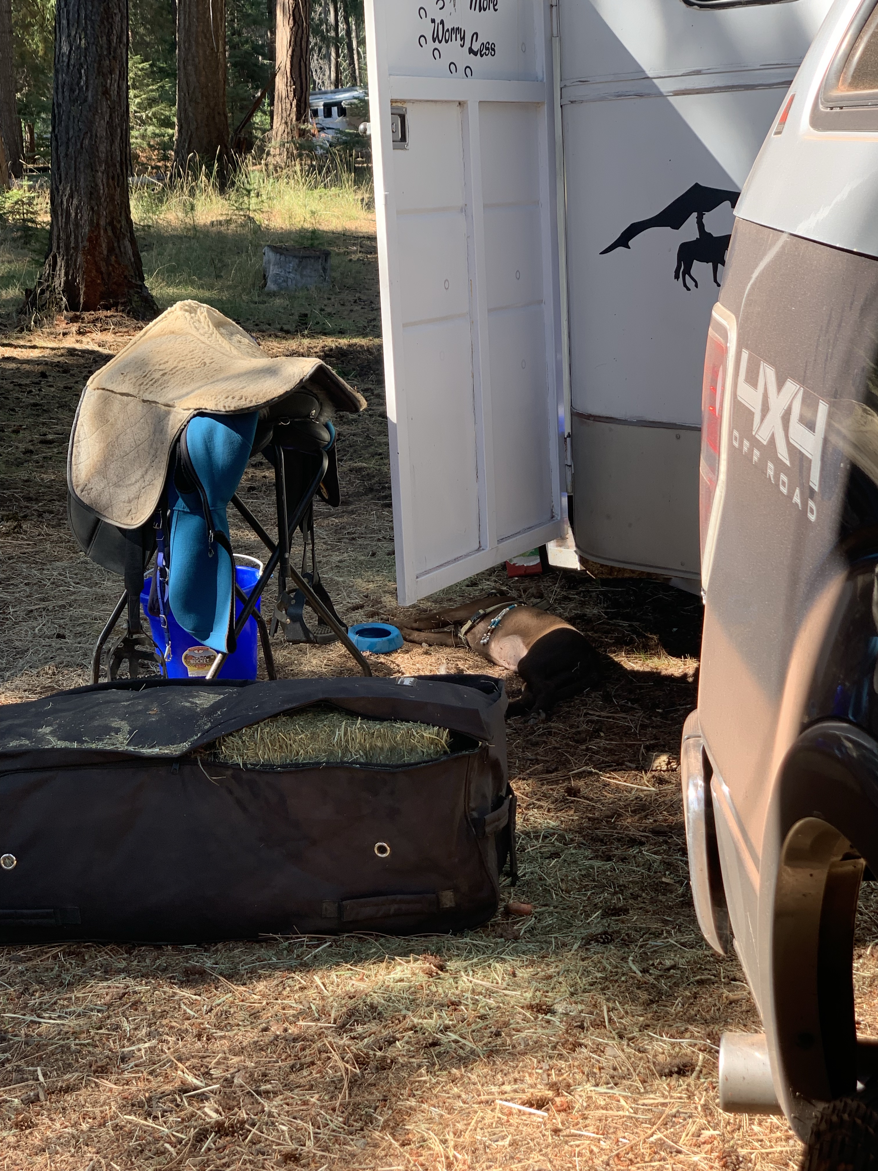 My second and more major mistake was not leashing Benny when some riders were coming back to camp, he got rolled by one of the horses before I could catch him. Thankfully there was a vet tech and a former zookeeper there to check him out. He’s fine, just a tad sore on one leg, and otherwise he had a fantastic weekend. I tied my bear bells to him to keep track of him, and when he got tired he fell asleep under my trailer. I was also able to ride several hours on Saturday without worry, as some folks pitched in to keep an eye on him.