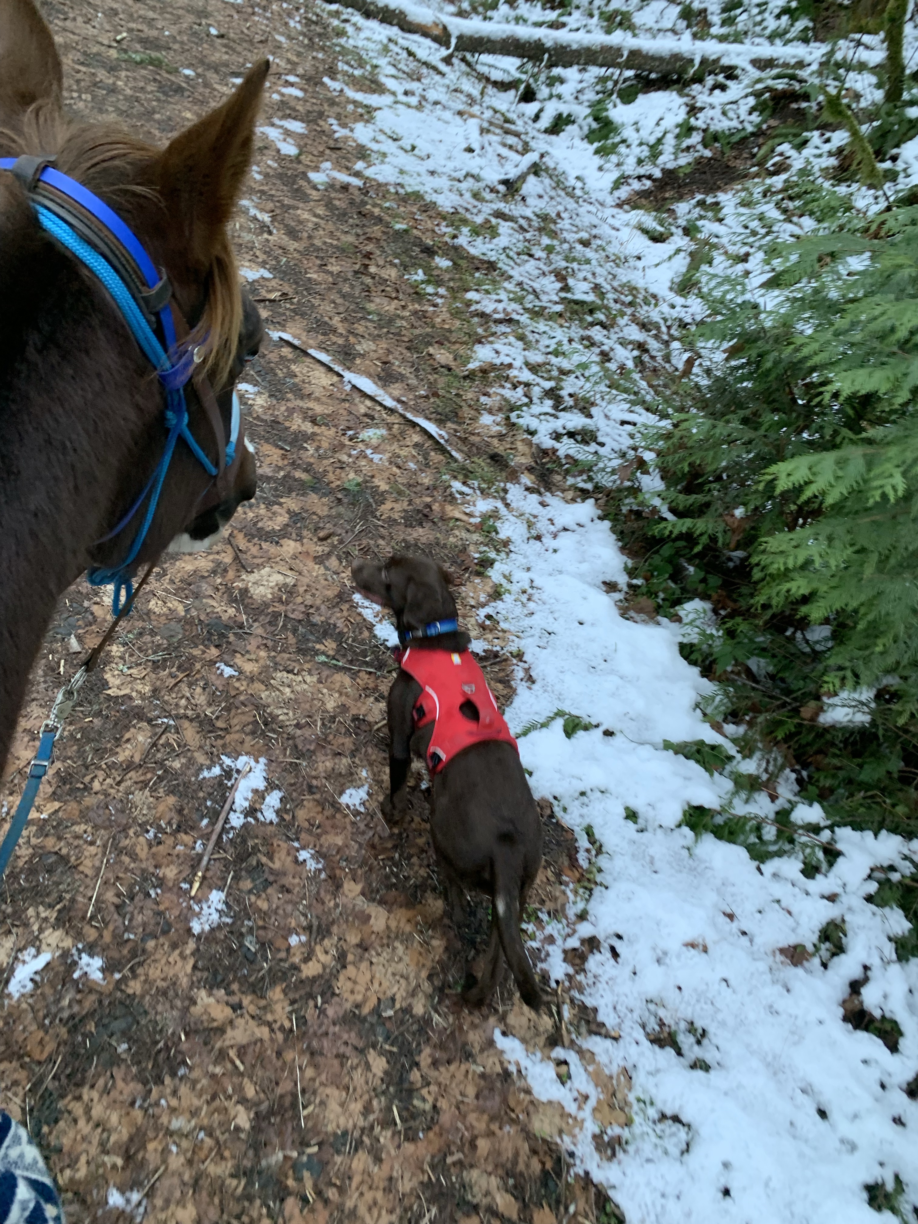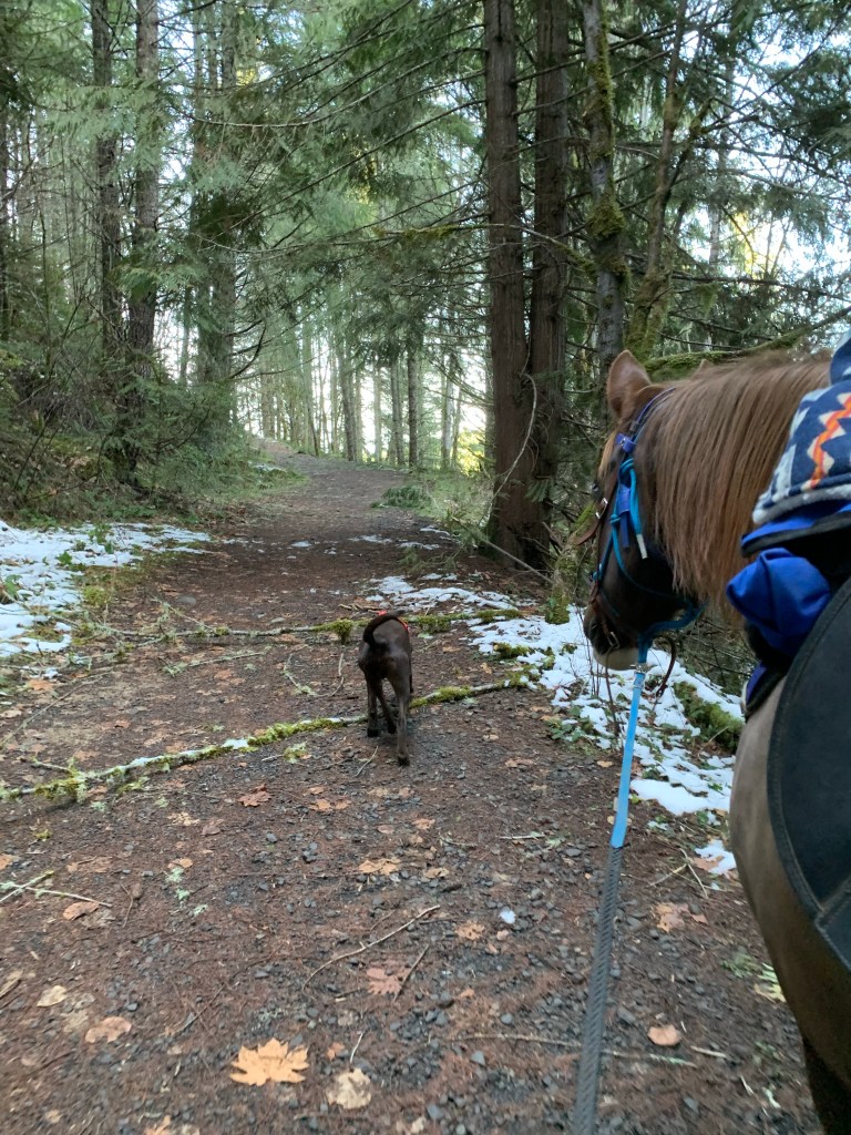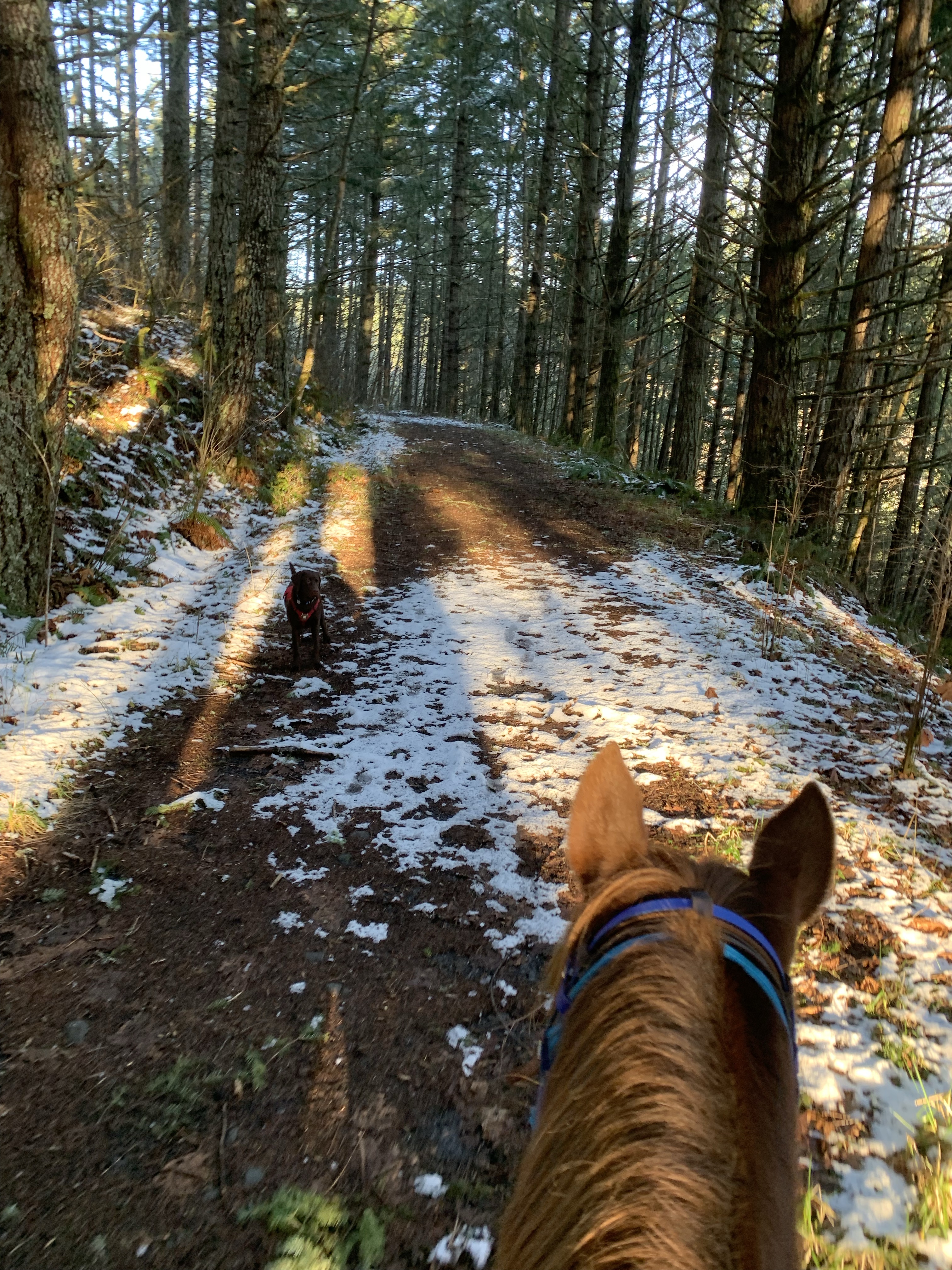 I was so focused on the Chocolates that I forgot to go pee at the trailhead, a requirement post two babies. Luckily there’s a hitching post at the top of the hill so I tied Tarma up and did my business and no one passed by. I checked tack and hopped on, shoving the leash in my saddlebags. We only saw one set of people, and from my perch I was able to warn them about the incoming puppy. Benny said an enthusiastic hello to their chocolate lab and followed me as soon as we passed, easy as pie.
