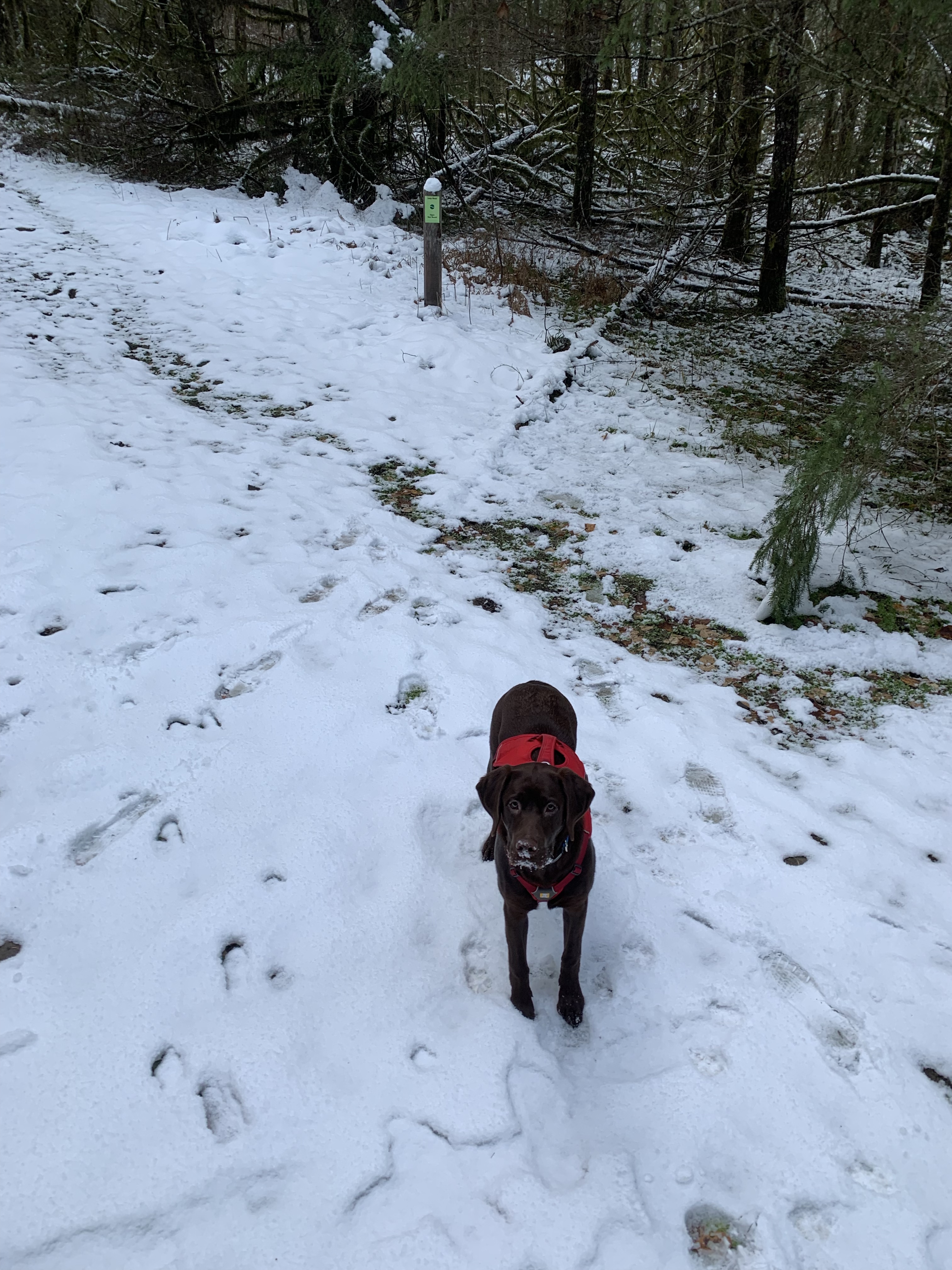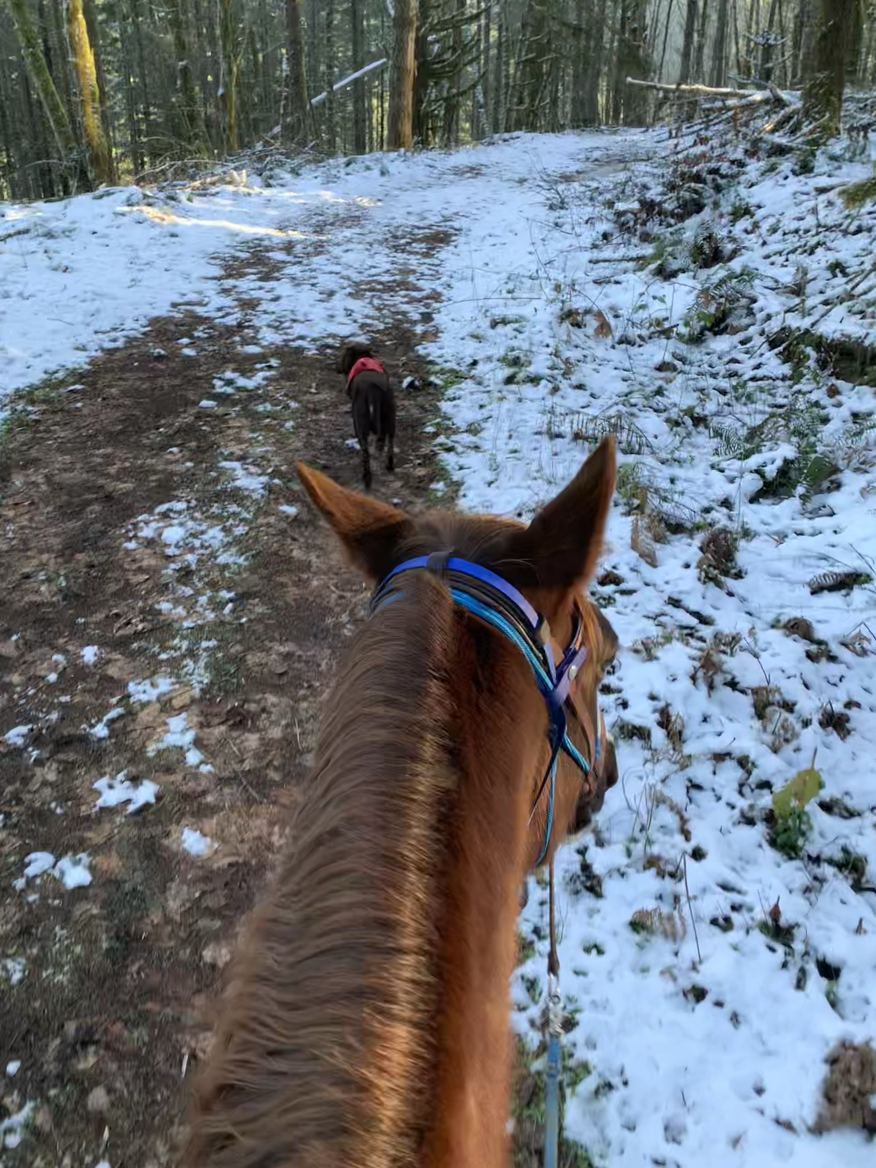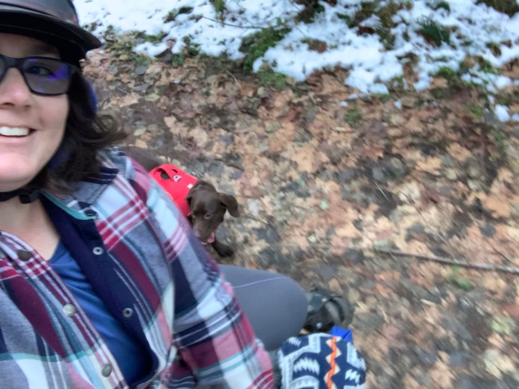 I was so focused on the Chocolates that I forgot to go pee at the trailhead, a requirement post two babies. Luckily there’s a hitching post at the top of the hill so I tied Tarma up and did my business and no one passed by. I checked tack and hopped on, shoving the leash in my saddlebags. We only saw one set of people, and from my perch I was able to warn them about the incoming puppy. Benny said an enthusiastic hello to their chocolate lab and followed me as soon as we passed, easy as pie.