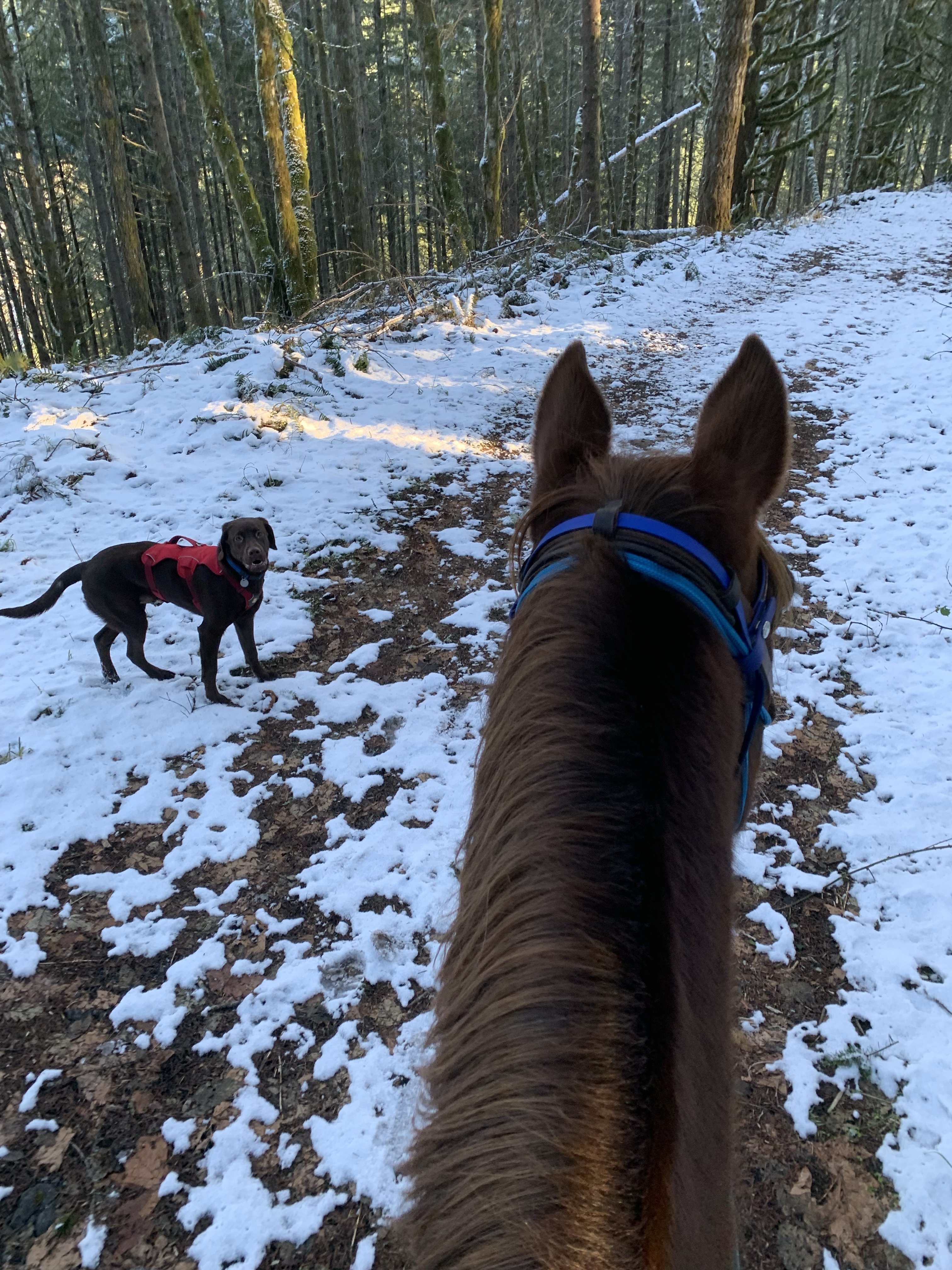 What fun! A great way to start off the new year indeed with your canine and equine besties! I did something sort of similar. I rode my horse, Shiloh, at home bareback on the last day of the year on an unusually warm Winter day in my area. Then on the first of the year, while it poured down rain, I went riding on a lesson horse at a near by barn in their indoor. Dogs weren’t involved in either ride, but one of the barn cats sat on the mounting block in the indoor arena and watched my lesson. 🙂