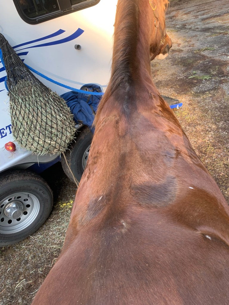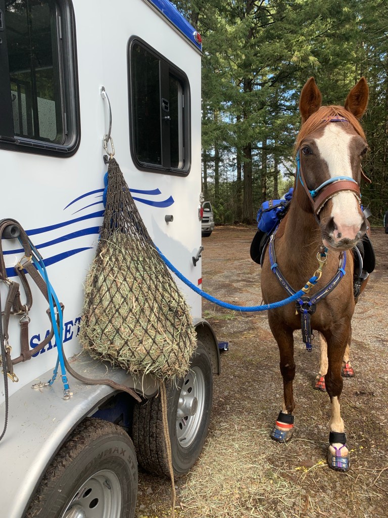 She loaded right up to head home easy as pie and kept eating. Her hay bag in the trailer has alfalfa in it and some local orchard, and her outside hay bag has coastal which is her absolute favorite, even more than alfalfa, and which she only gets when we adventure out. I had enough horse by the time we got home to trot around, though with a bit more encouraging than before we rode almost 9 miles and almost died together. Ah, bonding!