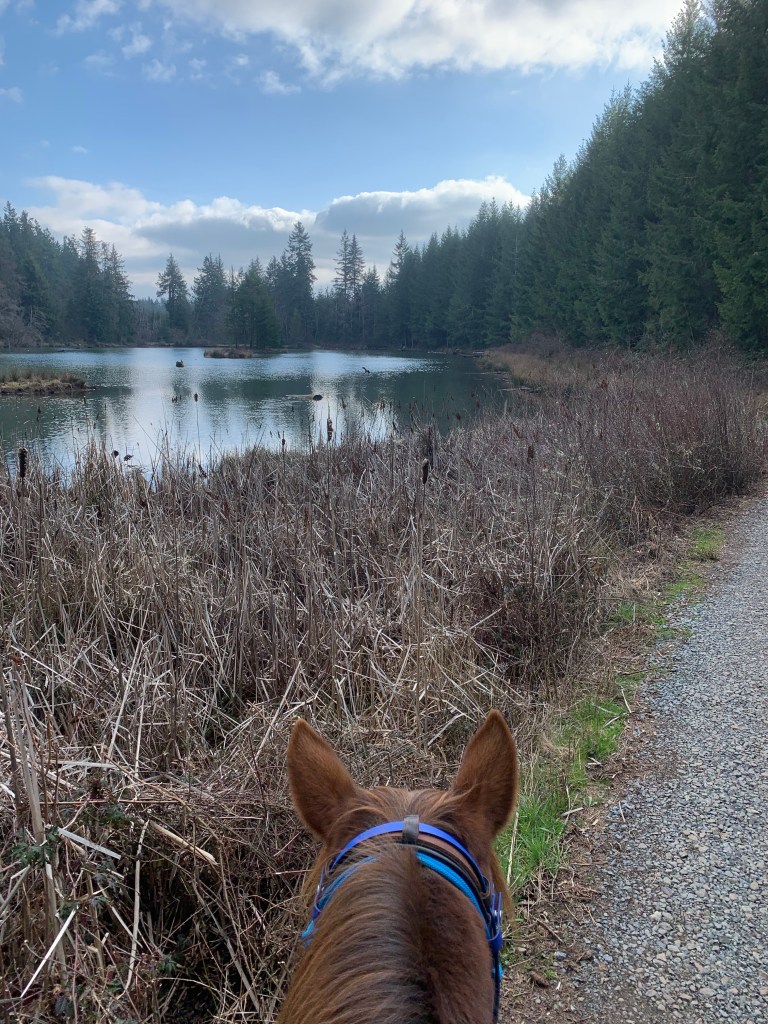 Enter: frisky spring cattle. I knew they were usually in one particular pasture, but in years of riding there I’d never had an issue with the cattle. Not these guys, they came barging up right at as and even though they were on the other side of a fence Tarma wasn’t sticking around. She exited stage right in a full on bolt, her worst one to date. I still couldn’t tell you how I stuck it, even with one hand fisted in her mane, though I had time enough to think I didn’t want to do the walk of shame back to the trailer if she dumped me. I managed to get her head turned around and as soon as we were heading back towards the cattle she stopped like any good cow pony, on a freaking dime. She let out a huge snort and then chewed, like “Oh, I ran from those guys? Ooopsie!” Even through they followed us along the fence line cavorting and farting for another minute or so, she didn’t care nearly as much. 100 yards away and I was back to one rein, though I did take time to lecture the cattle for testing my blood pressure.