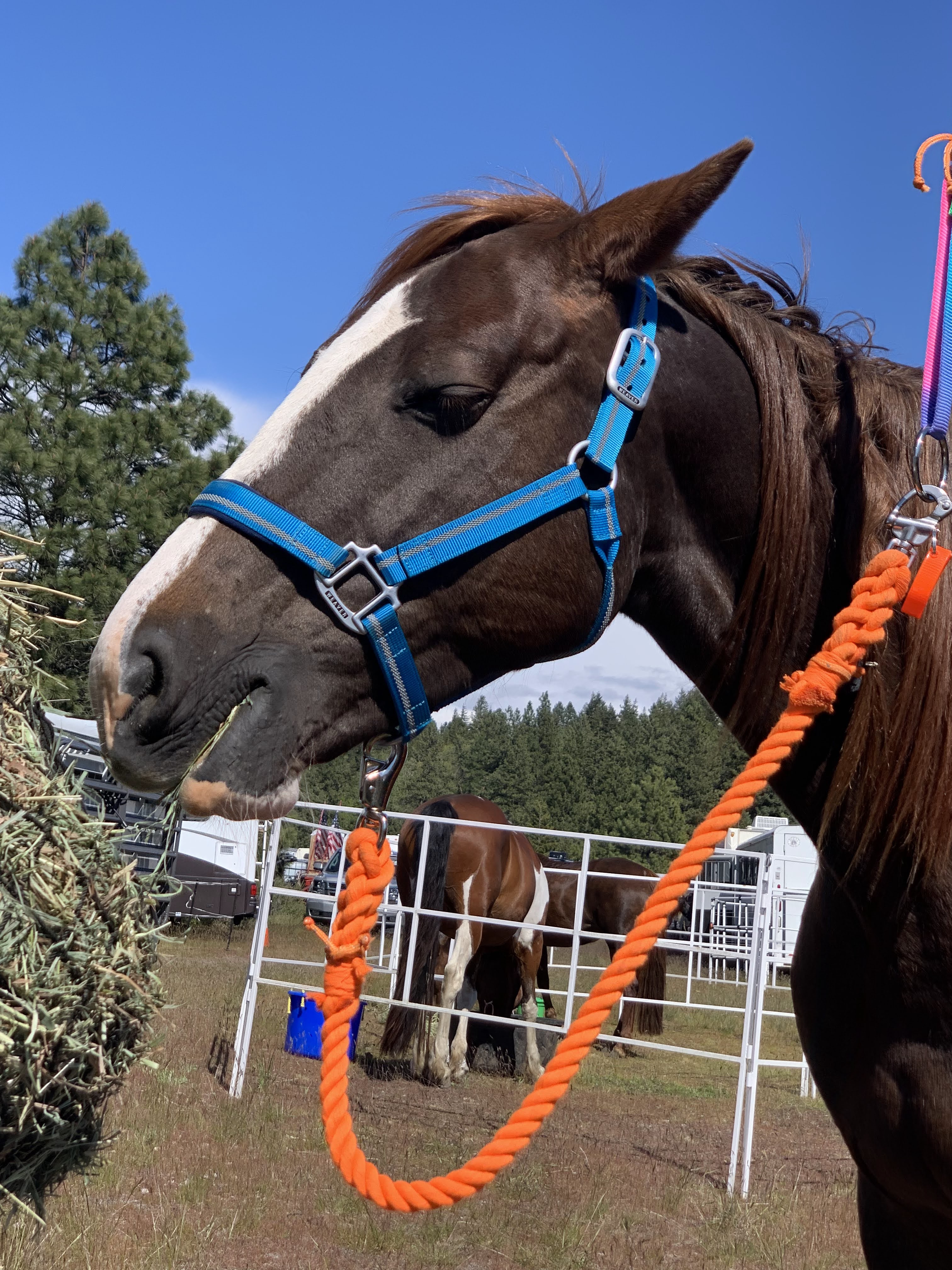 - Horse food: Finally, I packed enough food for the horse! All it took was an entire bale bag of mostly low sugar orchard, some flaked alfalfa, a Rubbermaid can full of coastal, both alfalfa pellets and cubes and beet pulp and LMF Showtime and an entire Costco bag of carrots, plus her prepacked supplements each day. I did run out of flaked alfalfa the third day, which Tarma wasn’t thrilled with, but she did have two other types of alfalfa so she didn’t suffer, I promise. Taking the Rubbermaid can was a stroke of genius, as I could put the hay bags in there to stuff them full each day.