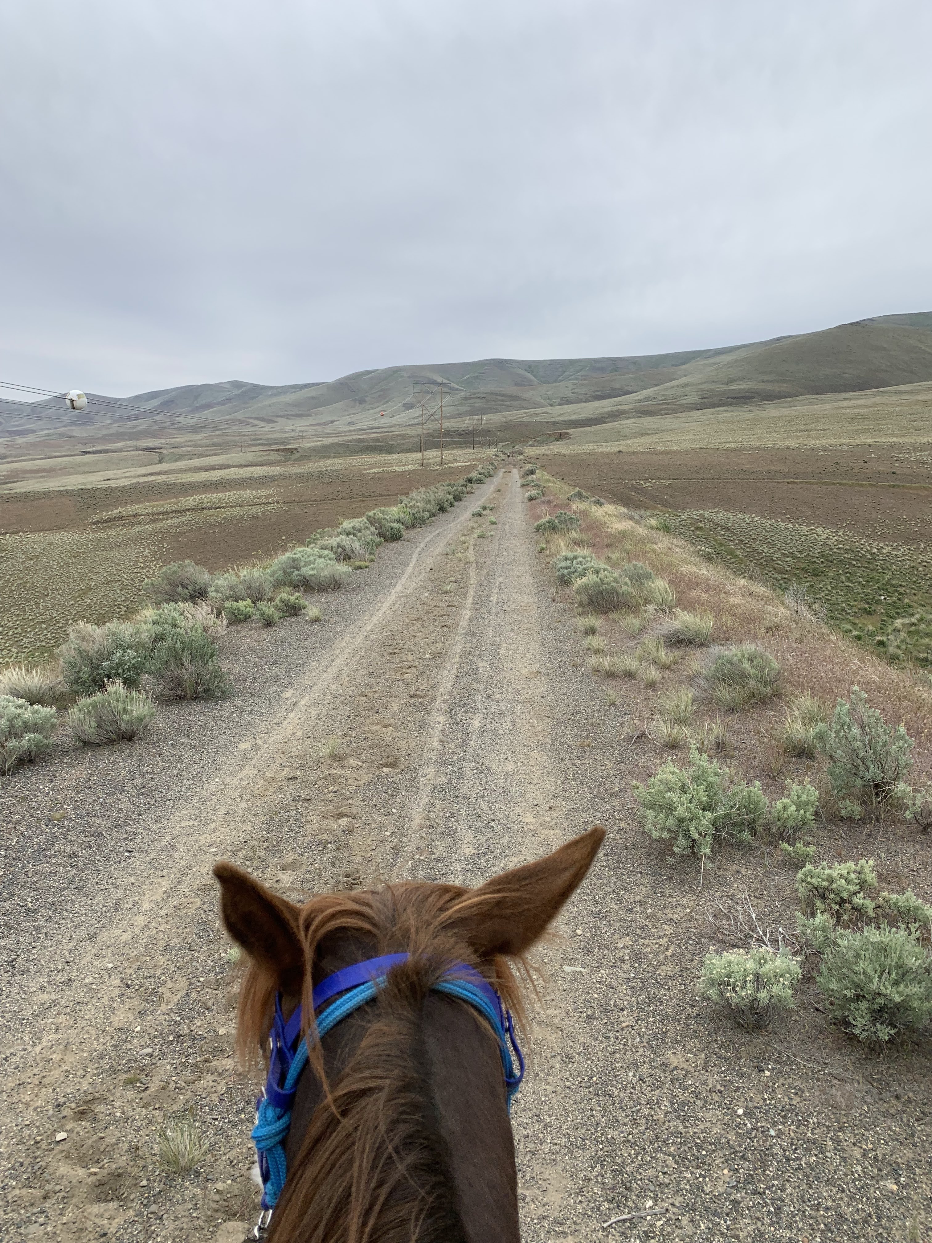 At roughly 17 miles in, Tarma decided I was forcing her on a death march and she was going to die in the howling, waterless wilderness. She alternated refusing to take another step with an angry, jarring, jiggy trot, that kind that makes you bite your tongue. It’s this kind of discussion that makes me glad I ride bitless, by design I can’t really hurt her by hauling on the reins. I had to do so about three times, including an actual one rein stop when she finally caught sight of horses in the distance and by Jove, she was going to catch up to them so they could save her from my evil, unreasonable demands. This was the only moment I felt disconnected from her, when I wondered if I’d asked too much. My solution was to hop off and walk a few miles. It took at least a mile and a half before she would accept treats from me. That’s Tarma’s sign that I’ve pushed her too far or worried her too much, she won’t take food until she’s more relaxed. The morning of the Ellensburg debacle, when they ended up tied for almost three hours, it took her a solid minute after I returned and untied her for her to accept a peppermint from me.