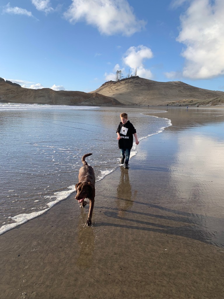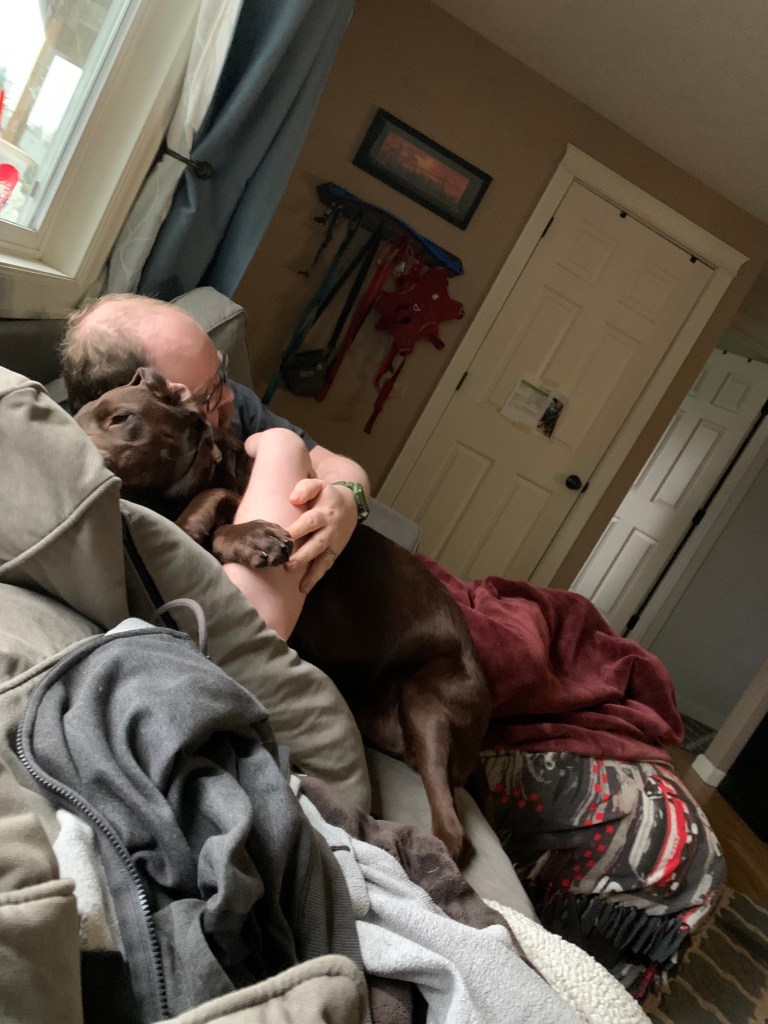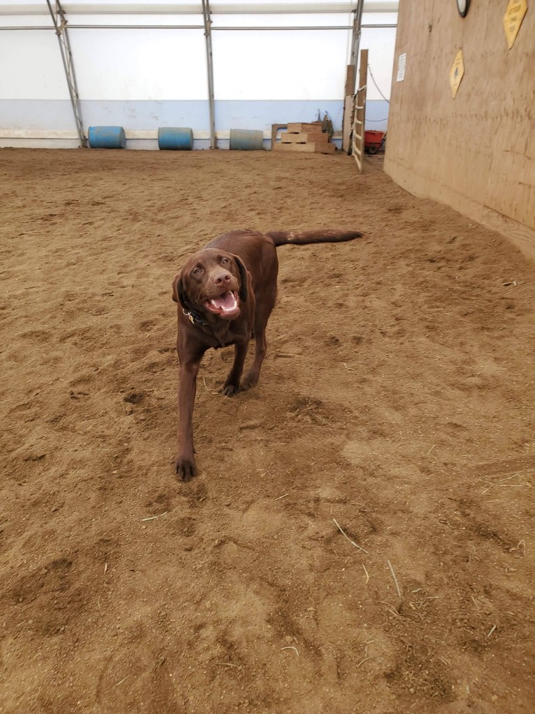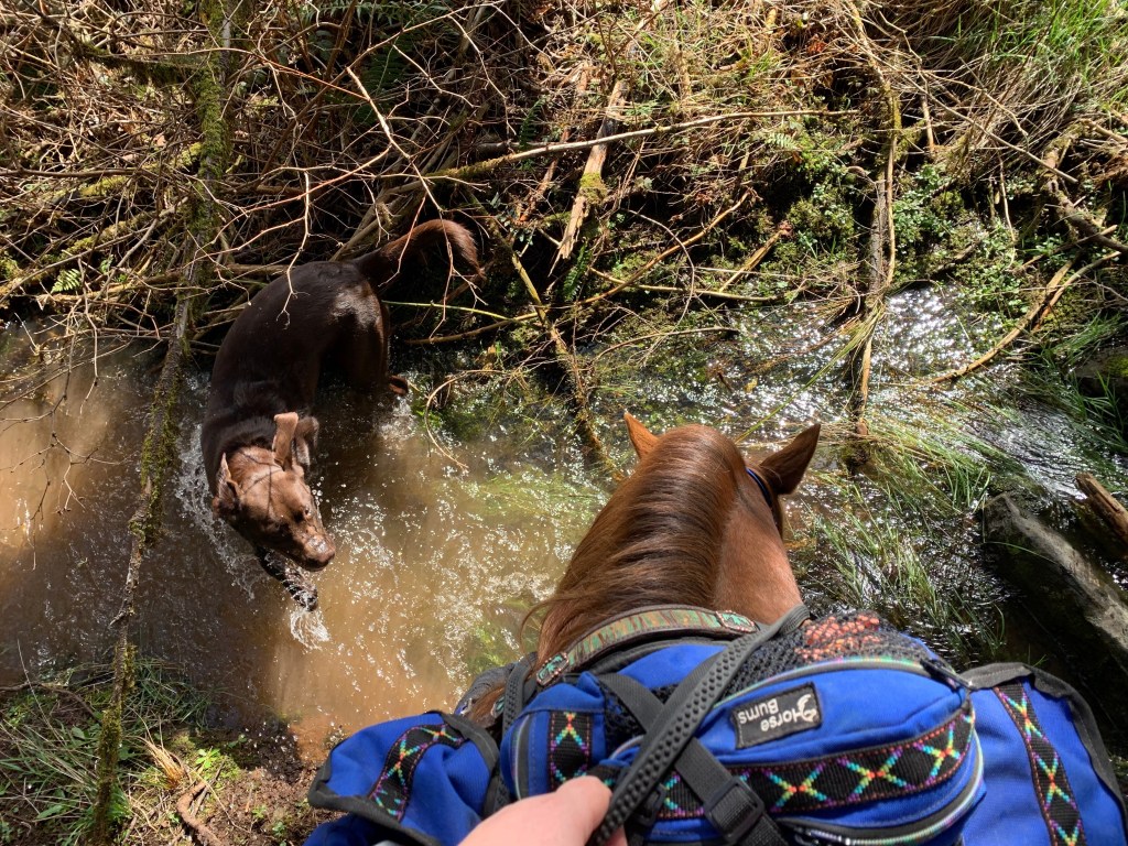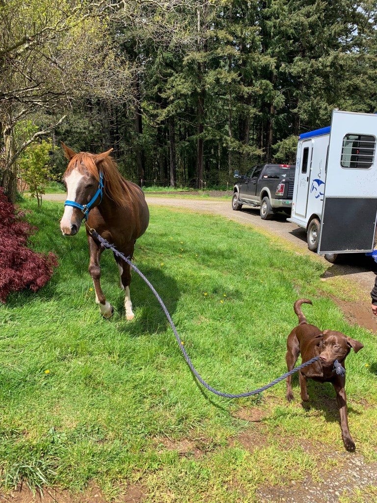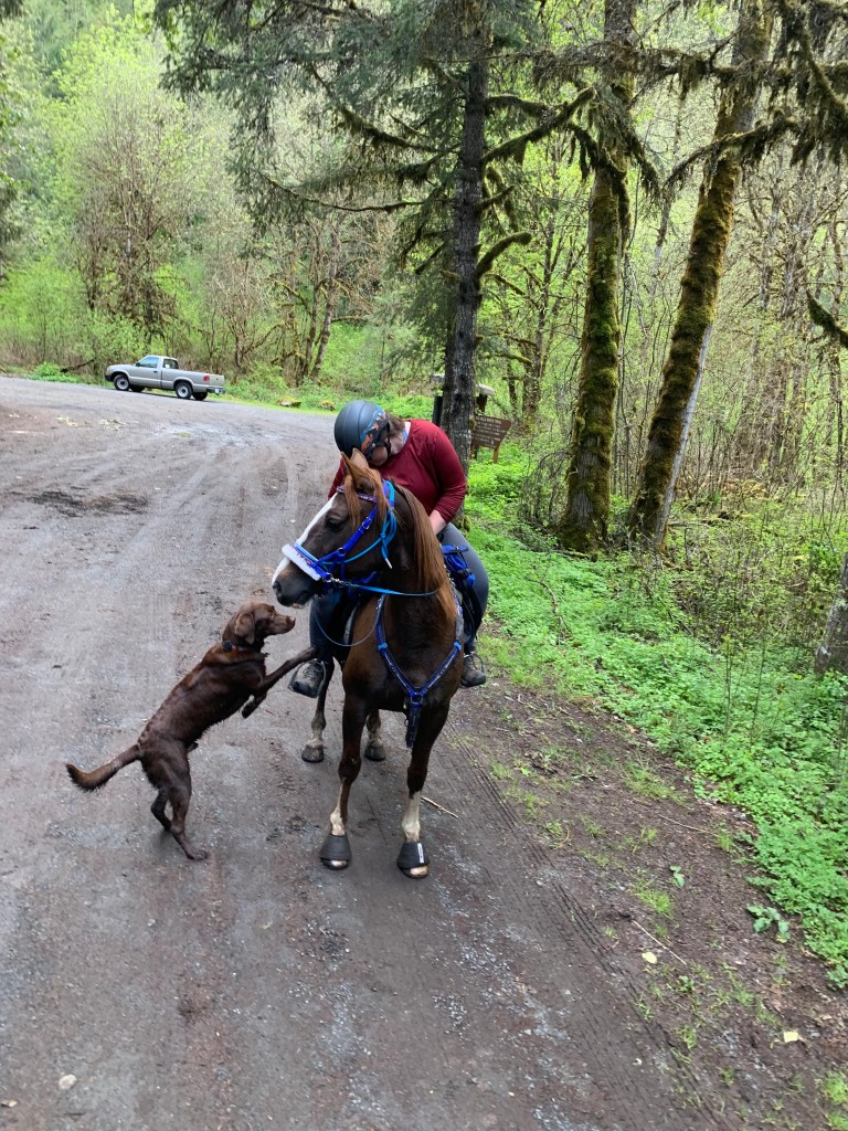 His current habits including laying in wait when he hears the school bus’s exhaust brakes and leaping for his kid’s face and chewing on his ear (why dog, why child, just, why?) He also tries to sneak into everyone’s showers and baths, which he sucks at because subtly is not in this dog’s nature. When he feels neglected, he’ll randomly huff and throw himself on the floor, causing the entire house to shake. He’s only lost one ball (which I threw over a fence, oopsie). He keeps trying to move his lunchtime walk earlier and earlier, mainly by sitting right behind me as I work and staring a hole in the back of my head. He follows the horse around just like Cyrus did when I’m in the ring…although he gets zoomies and Tarma’s learned to tolerate him, including rolling when he’s sprinting around her…or running underneath her and whacking her with a stick when she’s trying to drink from a stream. Best mare!