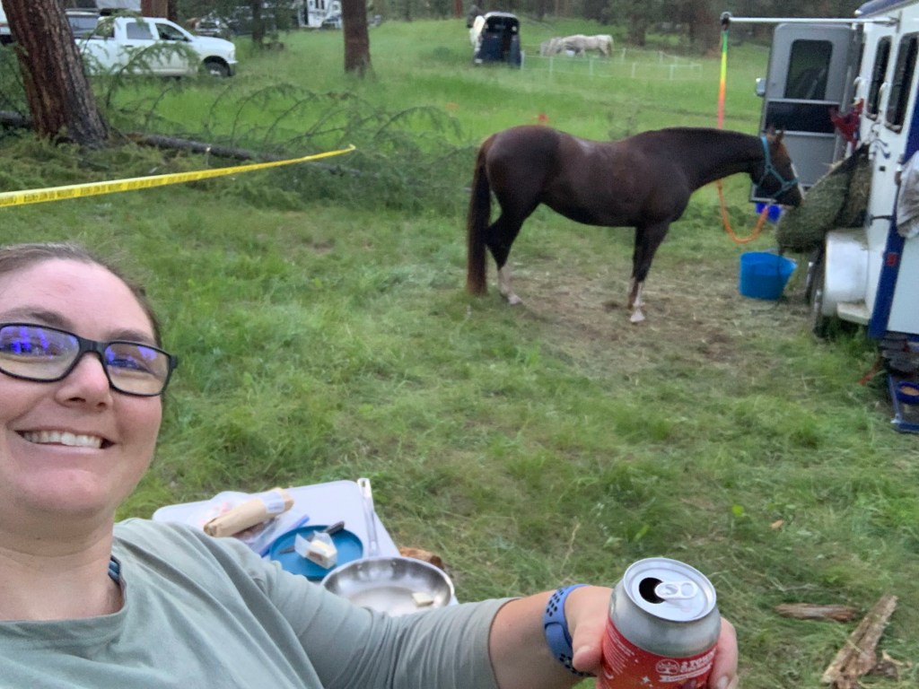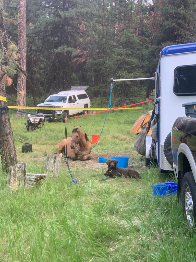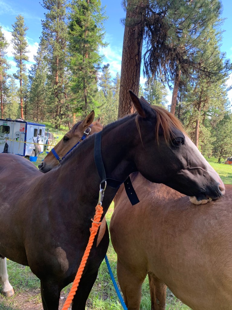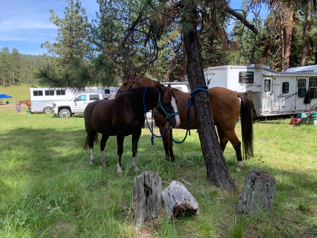 Everything about this weekend, minus a few Cody caused mishaps, felt…smooth. It was wonderful to see so many folks, to receive help and give help in turn. Thanks to all the futzing with my trailer for the John Wayne ride, most of my stuff was already packed, and my husband helped me finalize a few organizational things. Tossing in my friend’s stuff was pretty straightforward, thanks to not needing panels (though Cody’s Hi-Tie will take some adjusting, the stinker). I want to point out here that Tarma was a comfortable old professional on her Hi-Tie all weekend, despite the buddy horses loosing all their marbles on either side of us. She even appreciated and did well with the collar our friend loaned us, instead of her halter. Cody, however, pulled off his halter one morning (making it all of twenty feet, only to snack on the beautiful, waist high grass all throughout camp), and got stuck on the rope and popped off the end of the Hi-Tie the last morning. Geldings.
