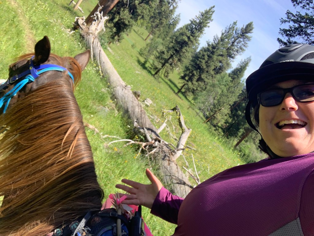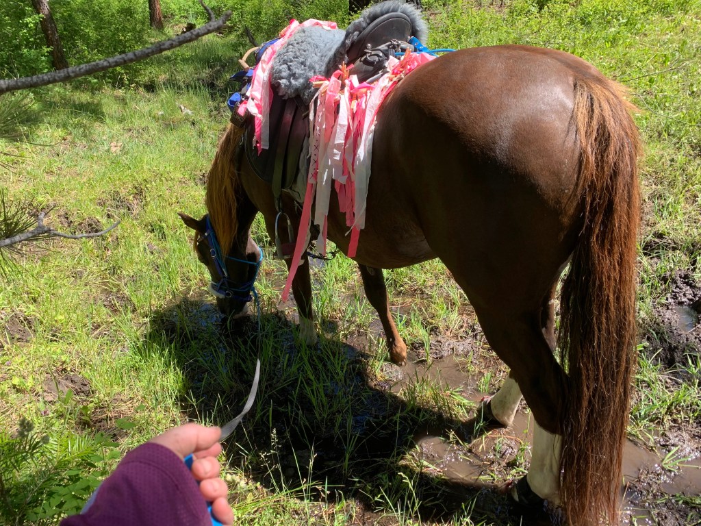 On one of the last, steepest hills, we almost had a moment. After roughly 8 miles of ribbons being stuck everywhere, half way down a super steep hill Tarma caught them out of the corner of her eye and froze, in that pre-bolt that all horse riders recognize. In the space of a breath, I swear I heard Tarma’s thoughts. “I can’t flip out here, we’ll die. Well, hell, let’s keep going and I can freak later!” Thankfully we made it down the hill and she kept going, but it’s one of those moments you can’t manage and no piece of tack will make a difference, just training and hours of work and relationship building with each other.