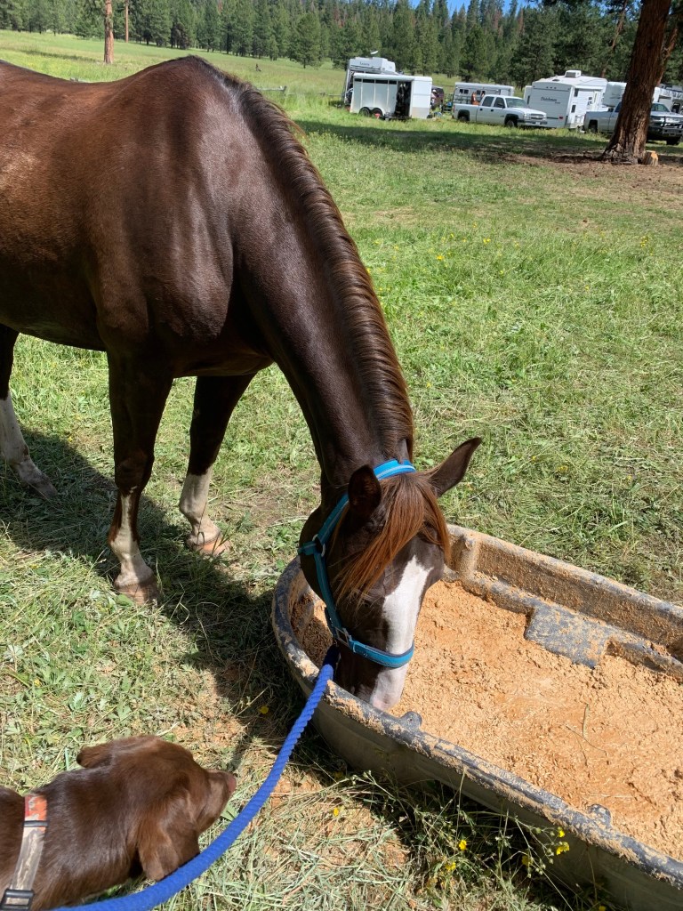We rolled in Thursday afternoon and nabbed a solid spot up the hill, right where all the trails headed out of camp, in a nice shady spot. A quick evening stroll and we settled into bed, already on camping hours. This was Benny’s first camping trip with the horses this year, and he was stellar, minus a few blown off recalls when folks made eye contact and went, “Cute dog!” Still, something to work on. He slept on my cot with me and we were mostly cozy, even though he’s a bit of a lump that I have to adjust around. At least he doesn’t snore! He did build up quite a stick collection that we had to disperse when we left. Friday was a long day, the trail ride with judged obstacles didn’t leave camp until 5pm! We took the horses for a few walks and I went for a hike with Benny, off the endurance trails, and made my way through a good book.
