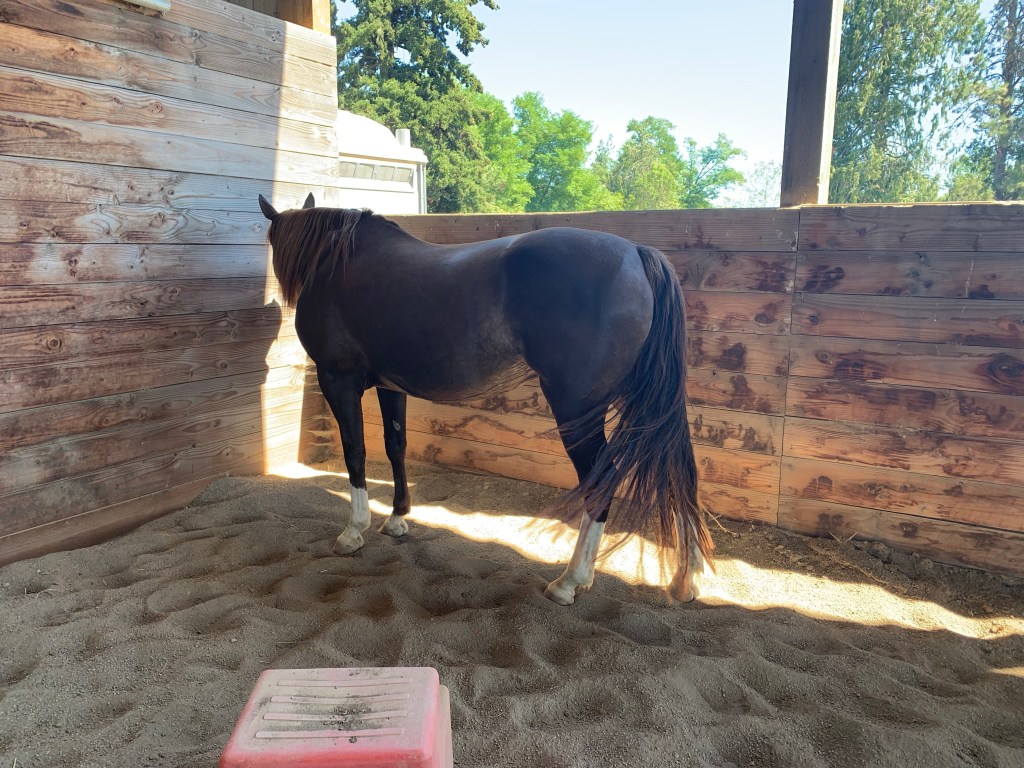 Eventually we made it to the barn, and I made sure to putz extra long prepping the trailer so my mood had time to disperse. My husband even warned me to ensure I didn’t take any of this to Tarma, and boy was he right. I was able to halter her easily enough in the pasture, but once I tossed her in the arena so I could change the gullet in the Wintec I had a different horse. Today was the type of day I feel utterly inadequate for what Tarma needs, I’m impatient and I have plans and agendas and Tarma just has feelings. I hear snatches and echos of so many wonderful horse folks, Warwick Shiller to Clay Wright to my best friends, but all Tarma has in that moment is me. I had the halter but I spent an endless amount of time just matching steps with her, not trying to herd her or get closer, just doing what she did. Just when I was wondering if she’d tune me out all damn day, she turned to me and accepted a treat and the halter.