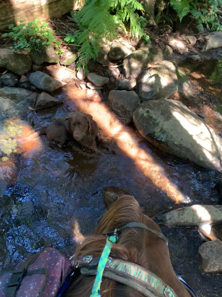 As soon as we hit the trail head, I unloaded a different horse. Tarma stood calmly, munching away while I tacked up and puttered. She didn’t even mind the traffic the occasionally whized by behind her. We crossed the road and mounted up and it was like the entire morning and early afternoon hadn’t happened. Despite not having gone out solo for awhile, we were on a loose rein the whole time. Benny was finally happy, and Tarma just marched out, as at peace with her life as she is in pasture. Neither horse nor dog put a foot wrong the entire seven miles, even when I had to hop off and save us from blackberries (and eat some too, Tarma doesn’t like them but Benny does). We even got in a long and steady and solid canter in a section that was safe for Benny, flowing up the trail in sync.