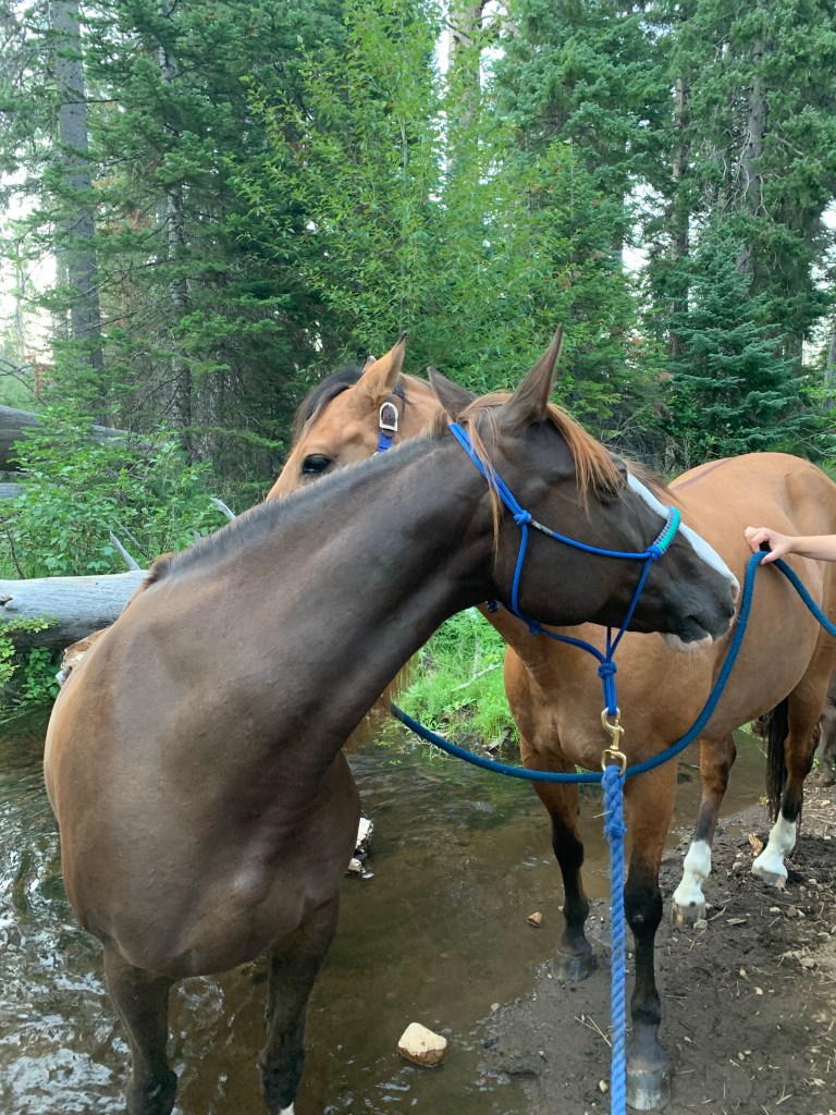 We were planning to go to Whitefish horse camp, father south, as I was hungry for those epic mountain views and glacial lakes that are only accessable for a few short months. Alas, nearby fires closed Whitefish, so we headed to Whispering Pines, a few miles outside Sisters instead. The road in is one of the best Forest Service roads I’ve been on in years! There were only two other rigs in camp, the major drawback being no pumped water. There is a creek nearby but you either have to haul water or take the horses down, which is no biggie as we wanted to soak their feet and stretch their legs. Otherwise its a beautiful and quiet camp, impeccably maintained with fresh gravel for the corrals and a handy wheelbarrow for manure.