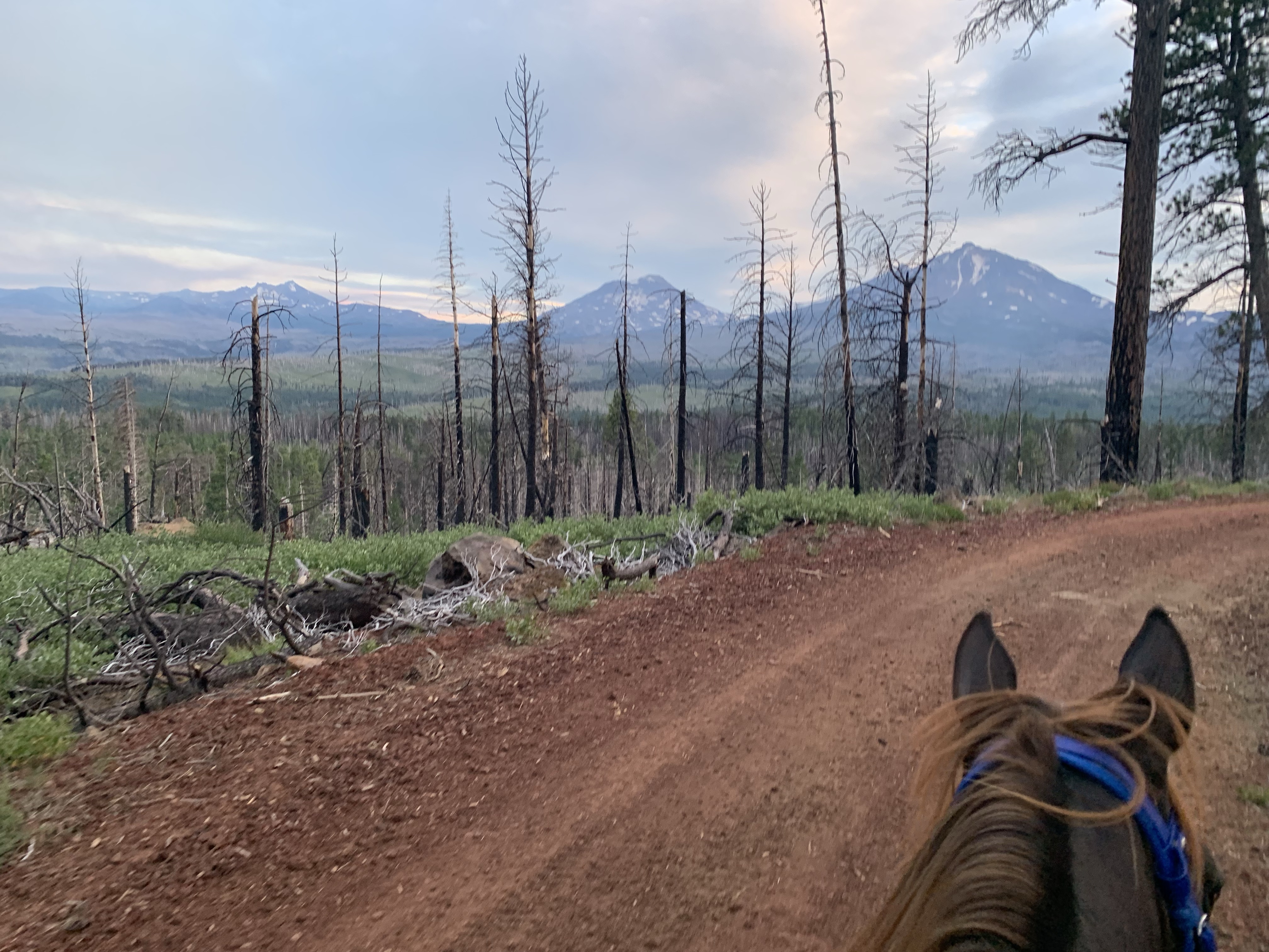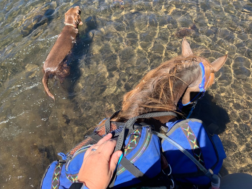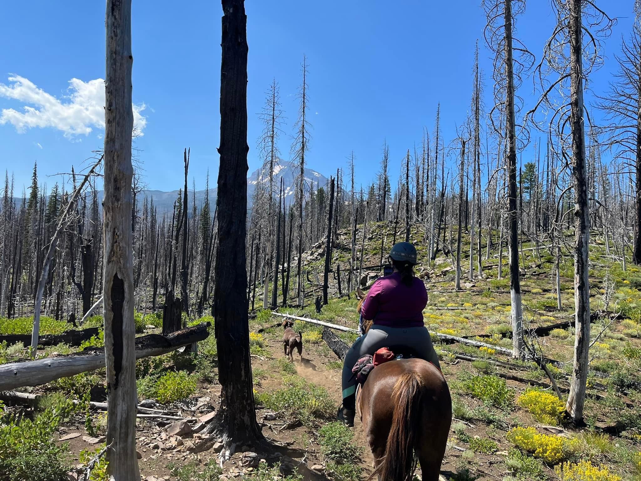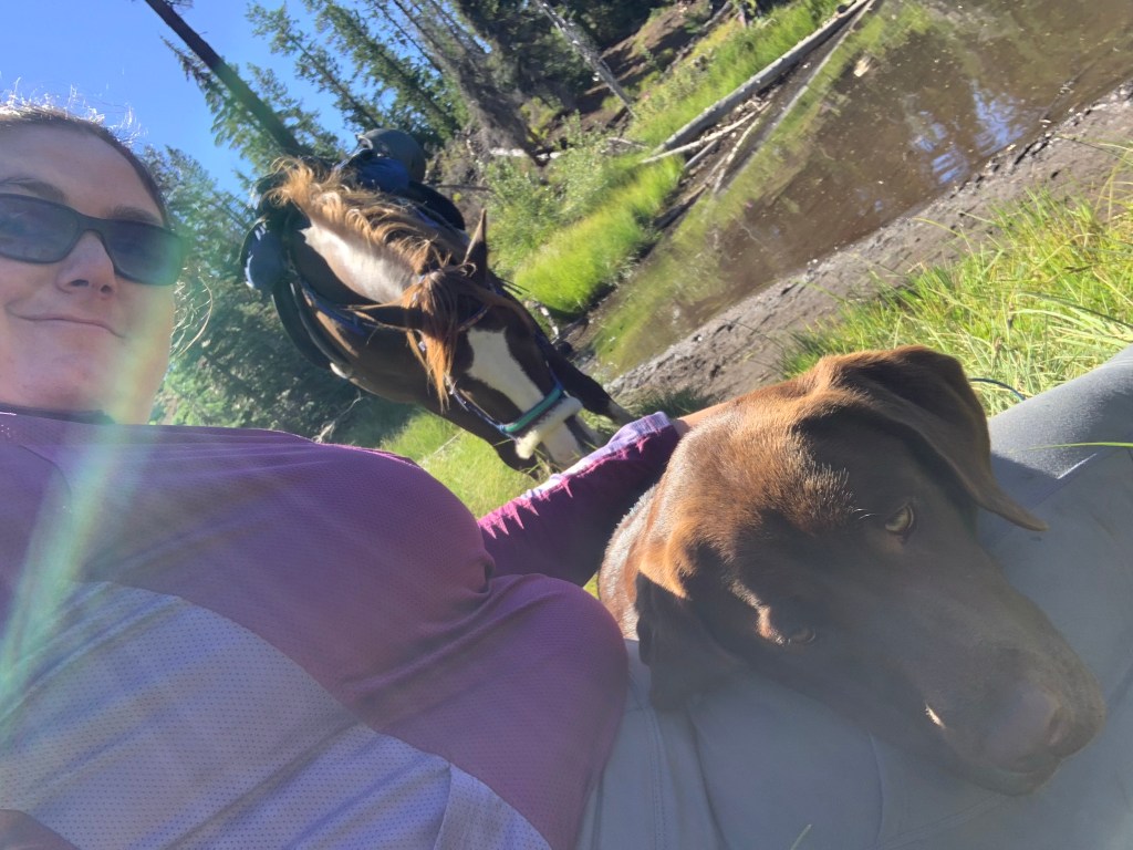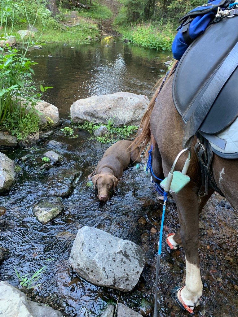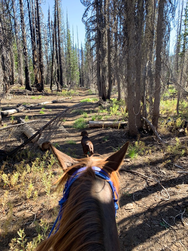 We managed to get through with some careful and slow detours, avoiding blowdowns and holes from burnt roots that can swallow a horse. I wouldn’t recommend this trail unless you know your horse and they can listen to you. I will mention it’s good Tarma tends to spook sideways and not a 180, as I usually stick with her. She decided one downed log was a bear and teleported sideways, and it wasn’t until we were trotting back down the trail again that my brain caught up and I shouted “WTF?” We took this last section slowly, giving Benny plenty of water and rest breaks. Thankfully I had my husband pick up four dog boots for him the week before, which were necessary for the long and rocky trails up there. He’s a tad sore and quite tired, but his paws are fine thanks to the boots.