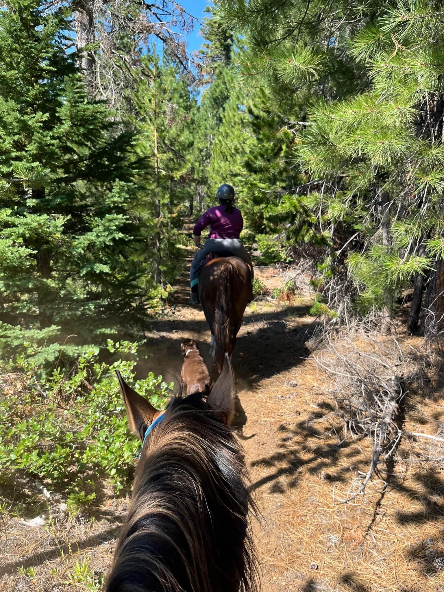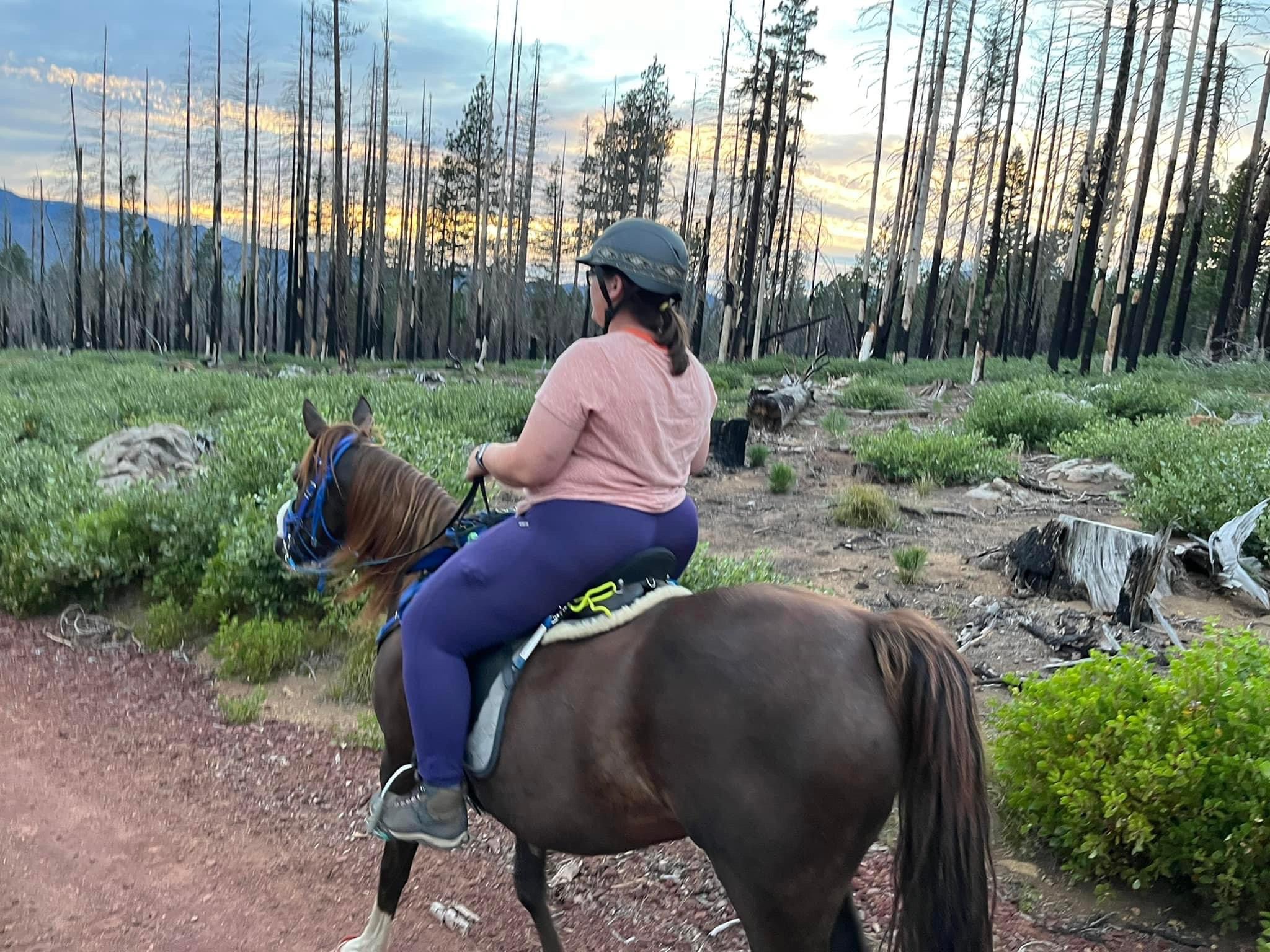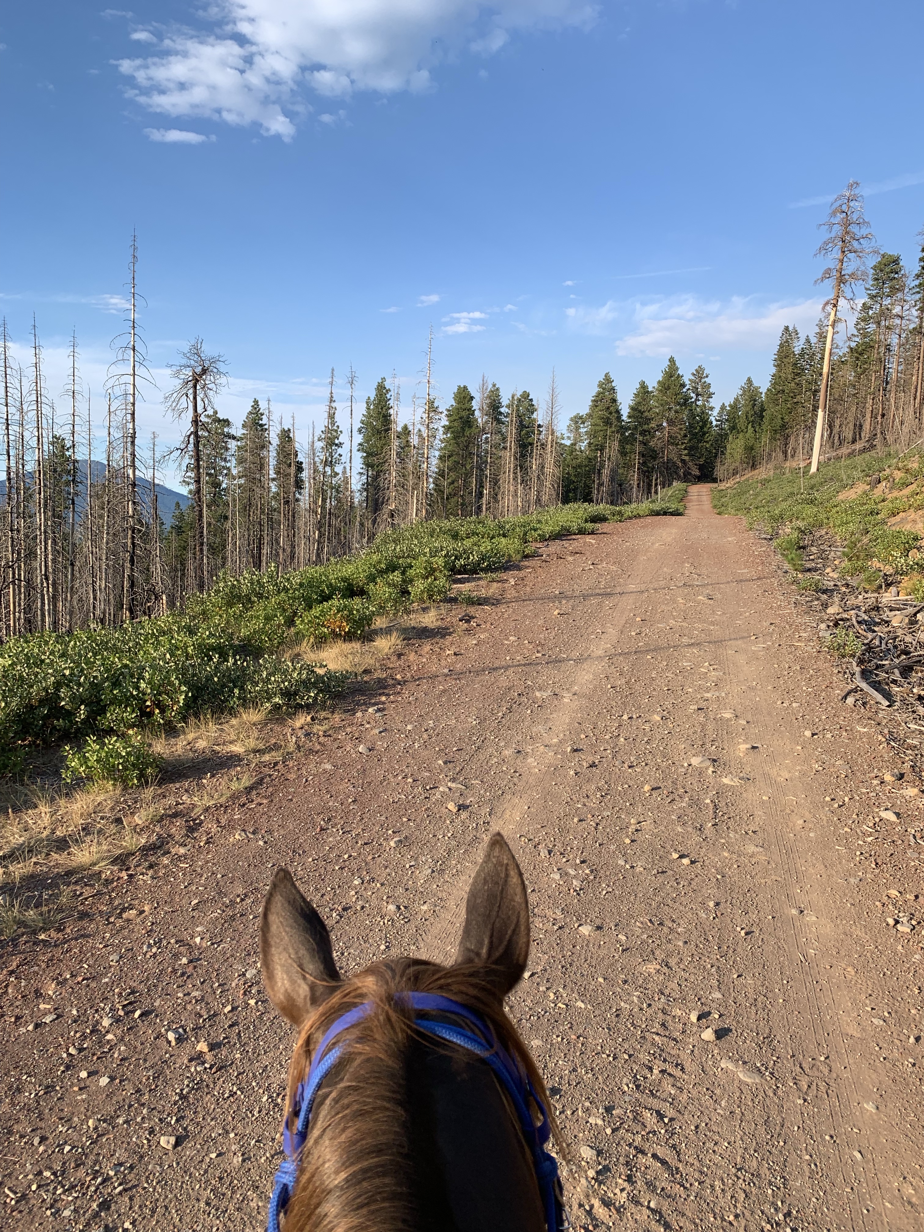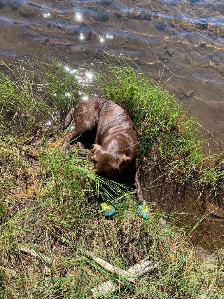 We managed to get through with some careful and slow detours, avoiding blowdowns and holes from burnt roots that can swallow a horse. I wouldn’t recommend this trail unless you know your horse and they can listen to you. I will mention it’s good Tarma tends to spook sideways and not a 180, as I usually stick with her. She decided one downed log was a bear and teleported sideways, and it wasn’t until we were trotting back down the trail again that my brain caught up and I shouted “WTF?” We took this last section slowly, giving Benny plenty of water and rest breaks. Thankfully I had my husband pick up four dog boots for him the week before, which were necessary for the long and rocky trails up there. He’s a tad sore and quite tired, but his paws are fine thanks to the boots.