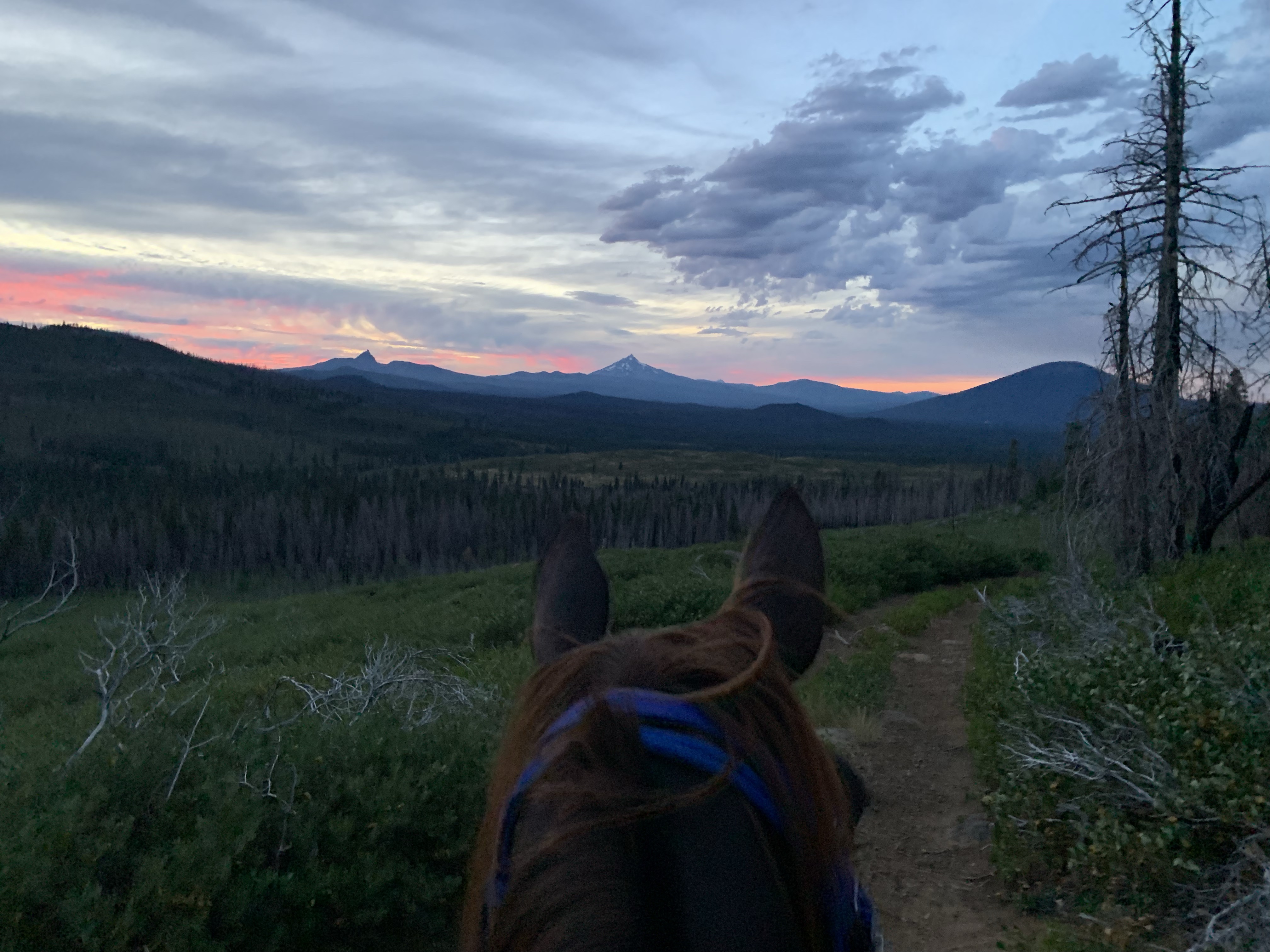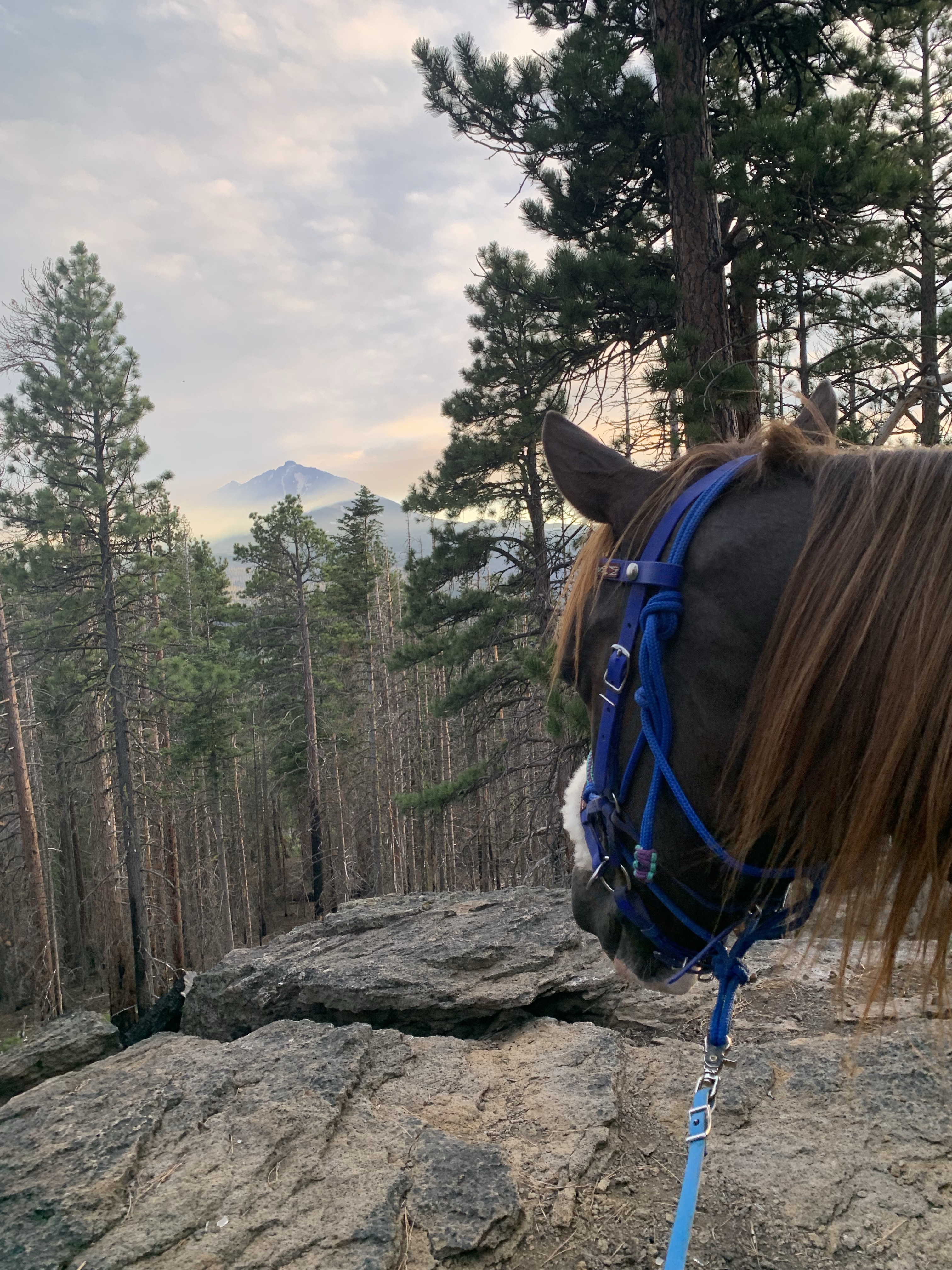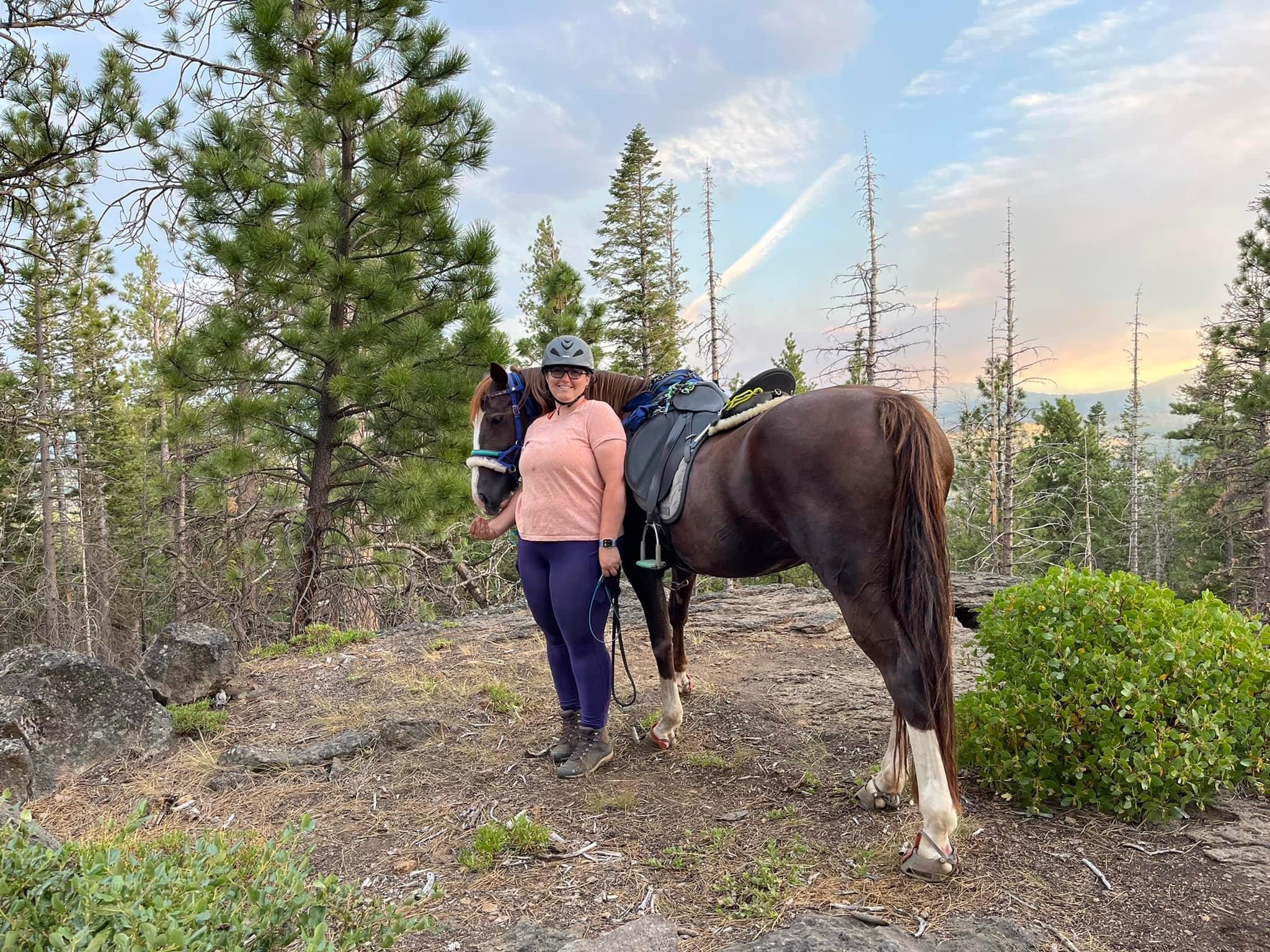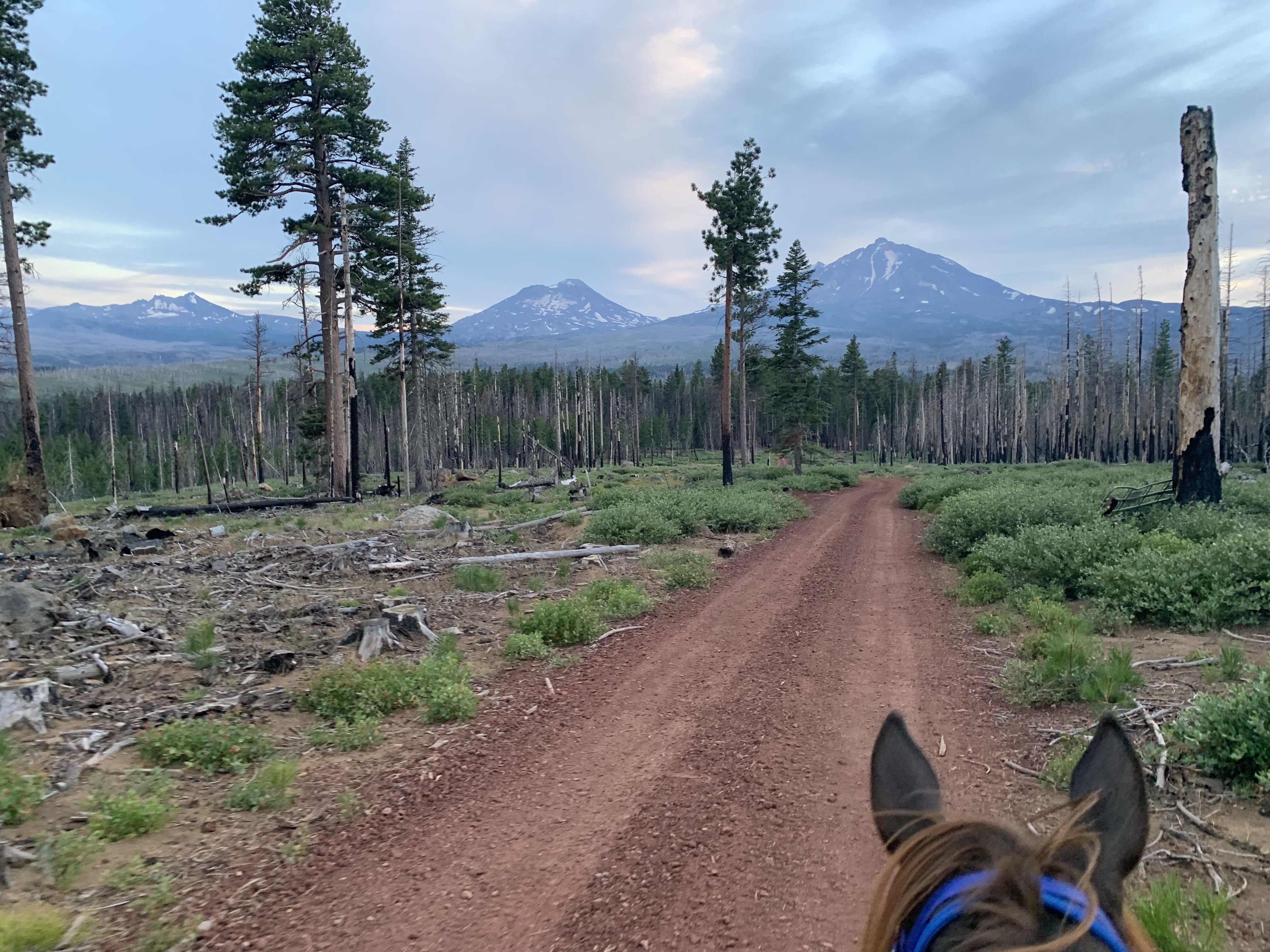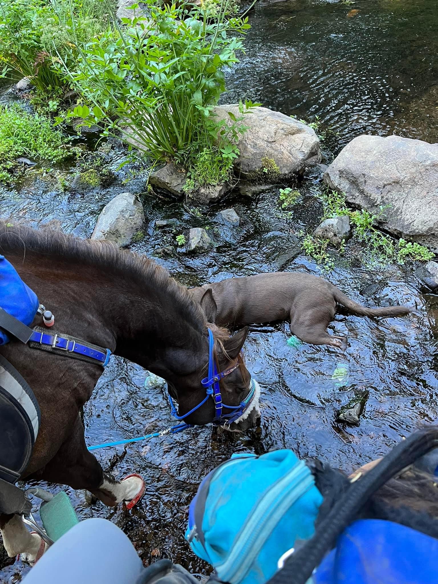 We managed to get through with some careful and slow detours, avoiding blowdowns and holes from burnt roots that can swallow a horse. I wouldn’t recommend this trail unless you know your horse and they can listen to you. I will mention it’s good Tarma tends to spook sideways and not a 180, as I usually stick with her. She decided one downed log was a bear and teleported sideways, and it wasn’t until we were trotting back down the trail again that my brain caught up and I shouted “WTF?” We took this last section slowly, giving Benny plenty of water and rest breaks. Thankfully I had my husband pick up four dog boots for him the week before, which were necessary for the long and rocky trails up there. He’s a tad sore and quite tired, but his paws are fine thanks to the boots.