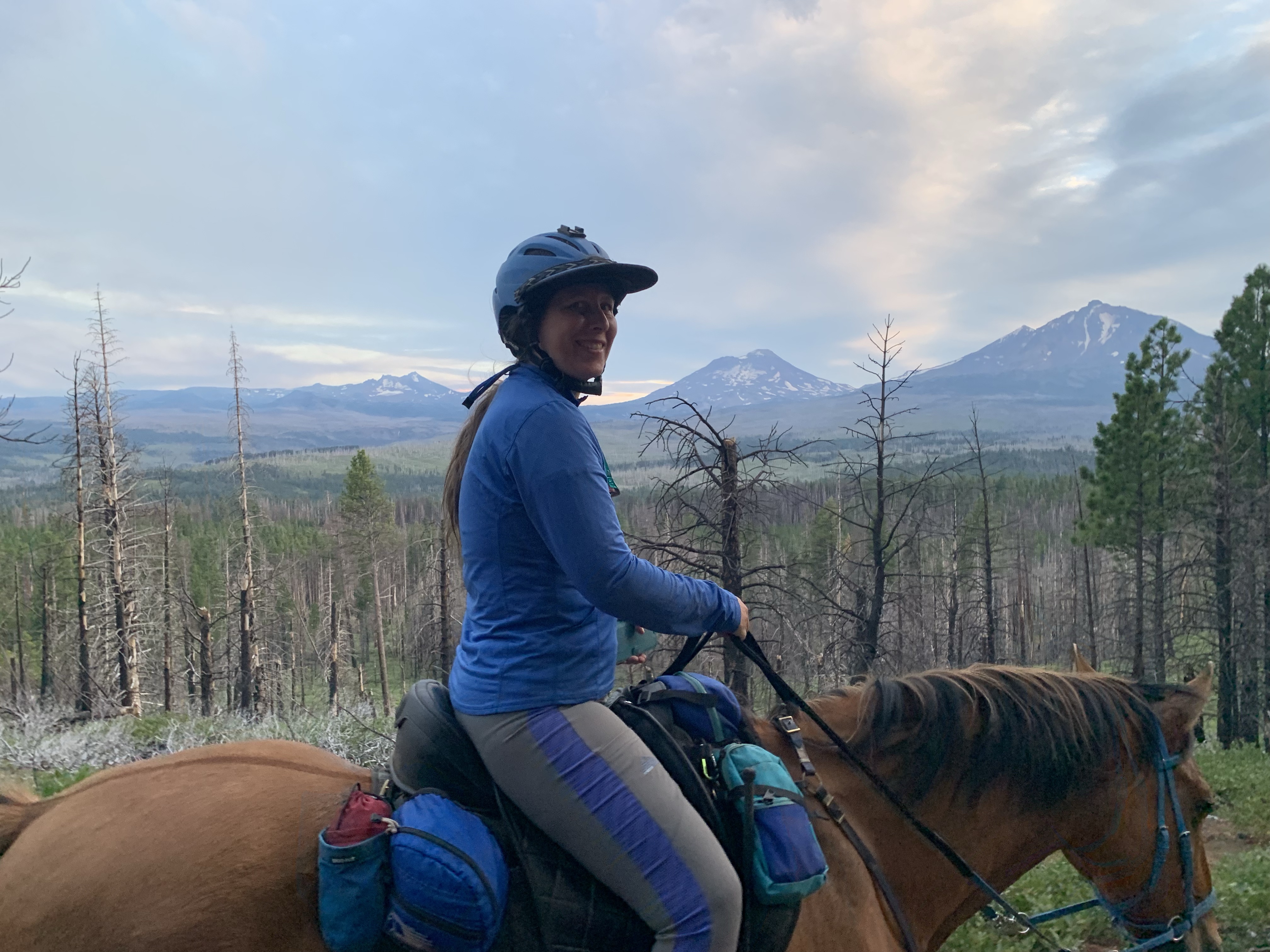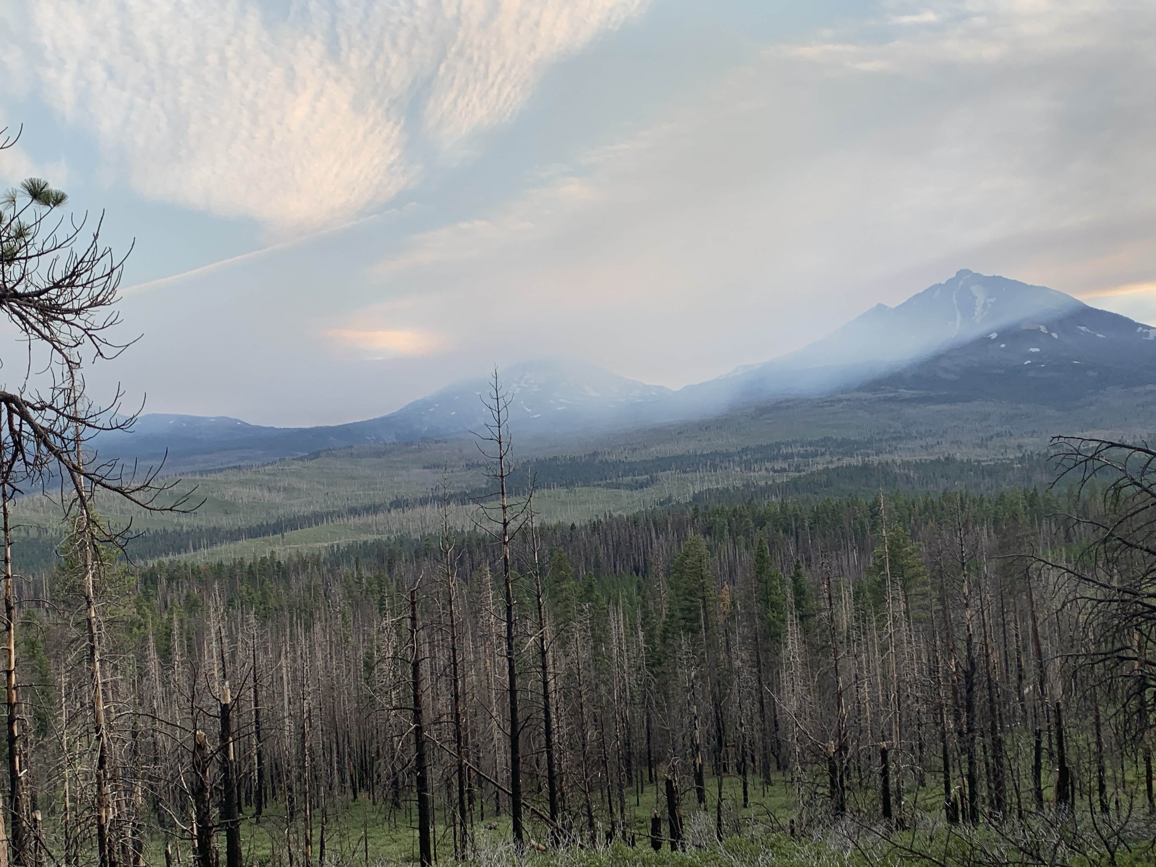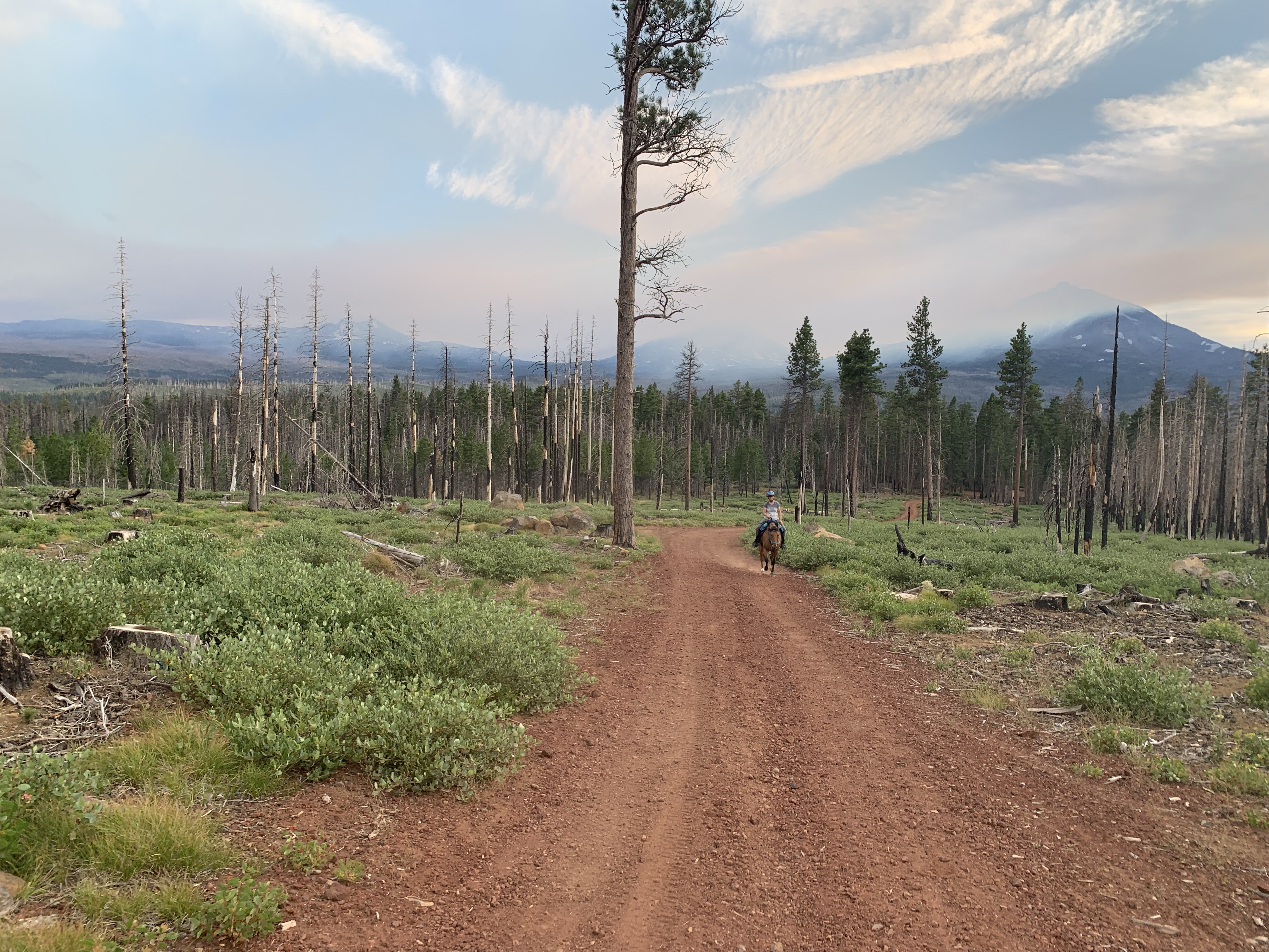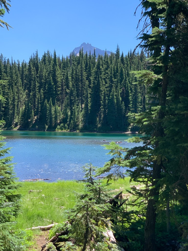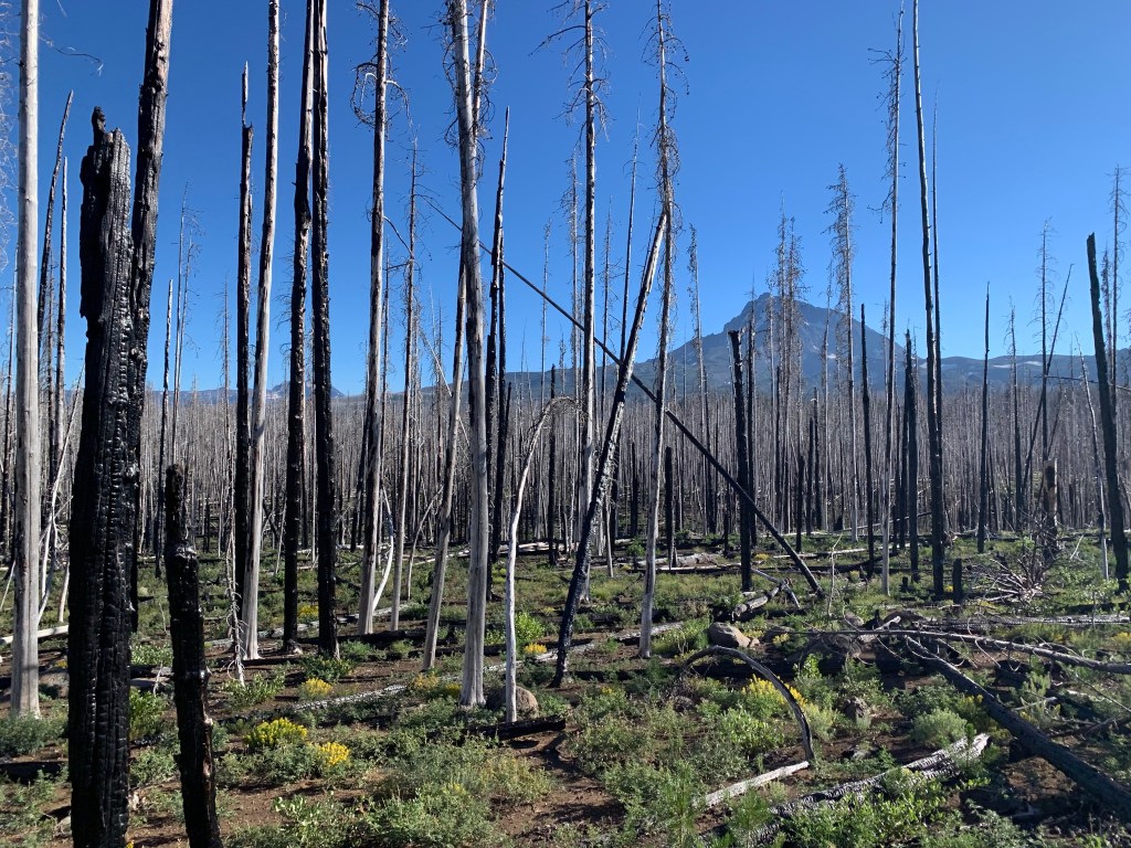 Our first day was a long ride, 19 miles by Rachel’s tracker (my Apple Watch died at mile 16). We headed up into the Three Sisters Wilderness, grabbing a free self issued wilderness permit at the Scotts Pass trailhead. About half of the trails burned but most were clear, and still had running water. One benefit to fire is it really opens up the views! I got to drink up the Three Sisters and Mt. Bachelor to the south and Black Butte and Mt. Washington to the north. We had lunch at one of the cold and clear Matthieu Lakes, Tarma standing in the lake and muching on bright green grass while Rachel hand fed my silly dog his lunch and her apple.