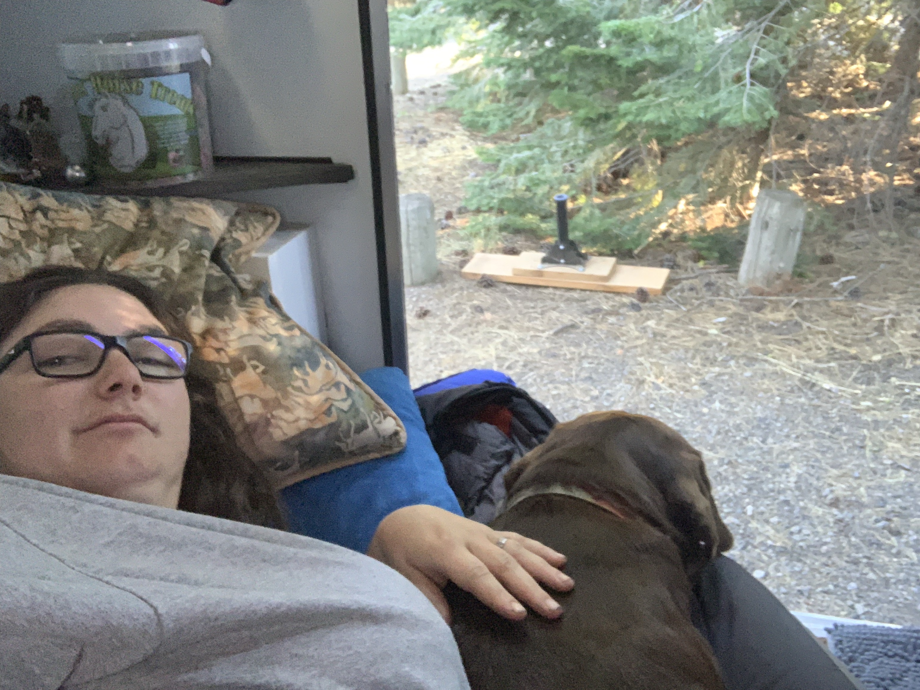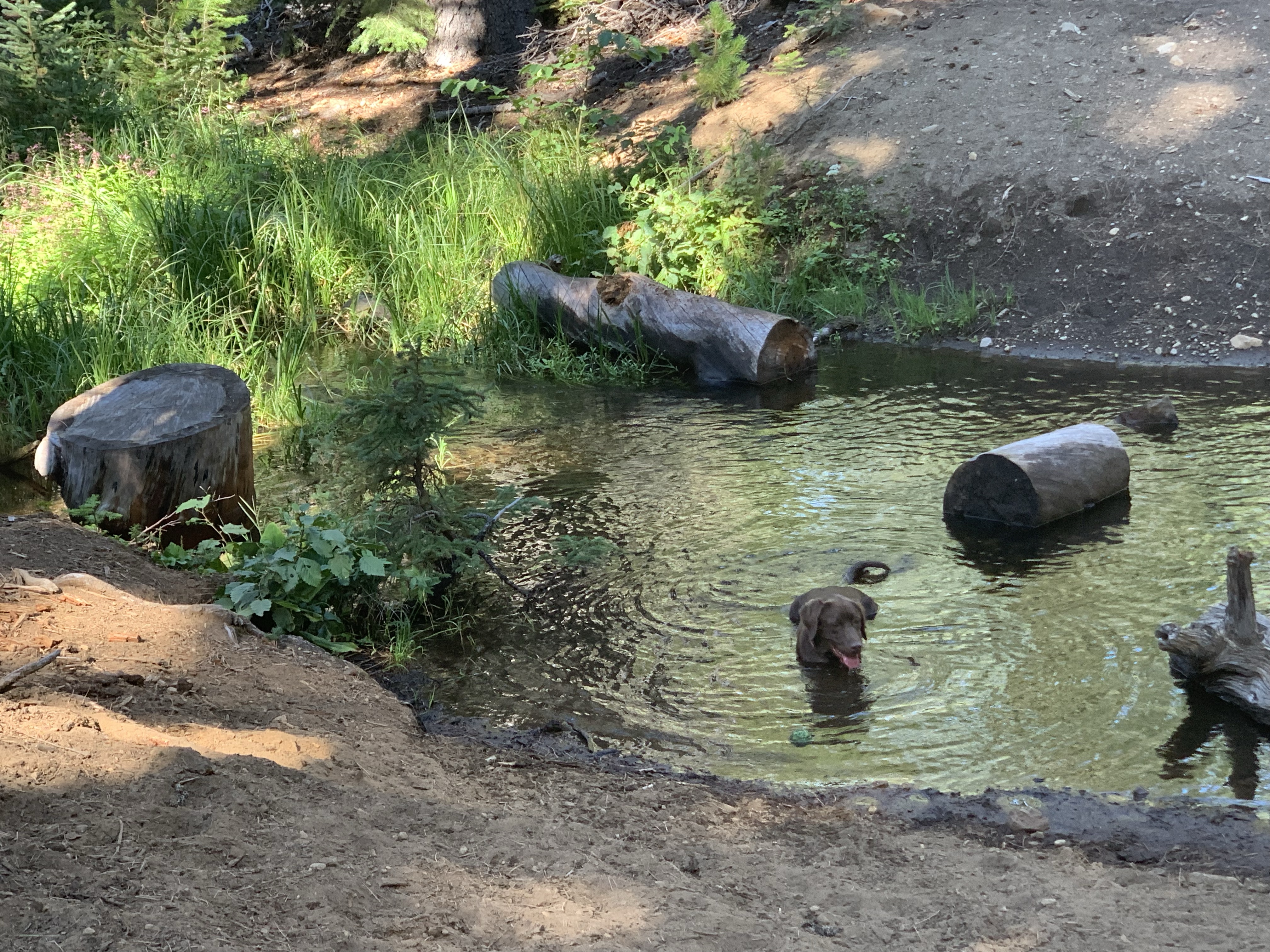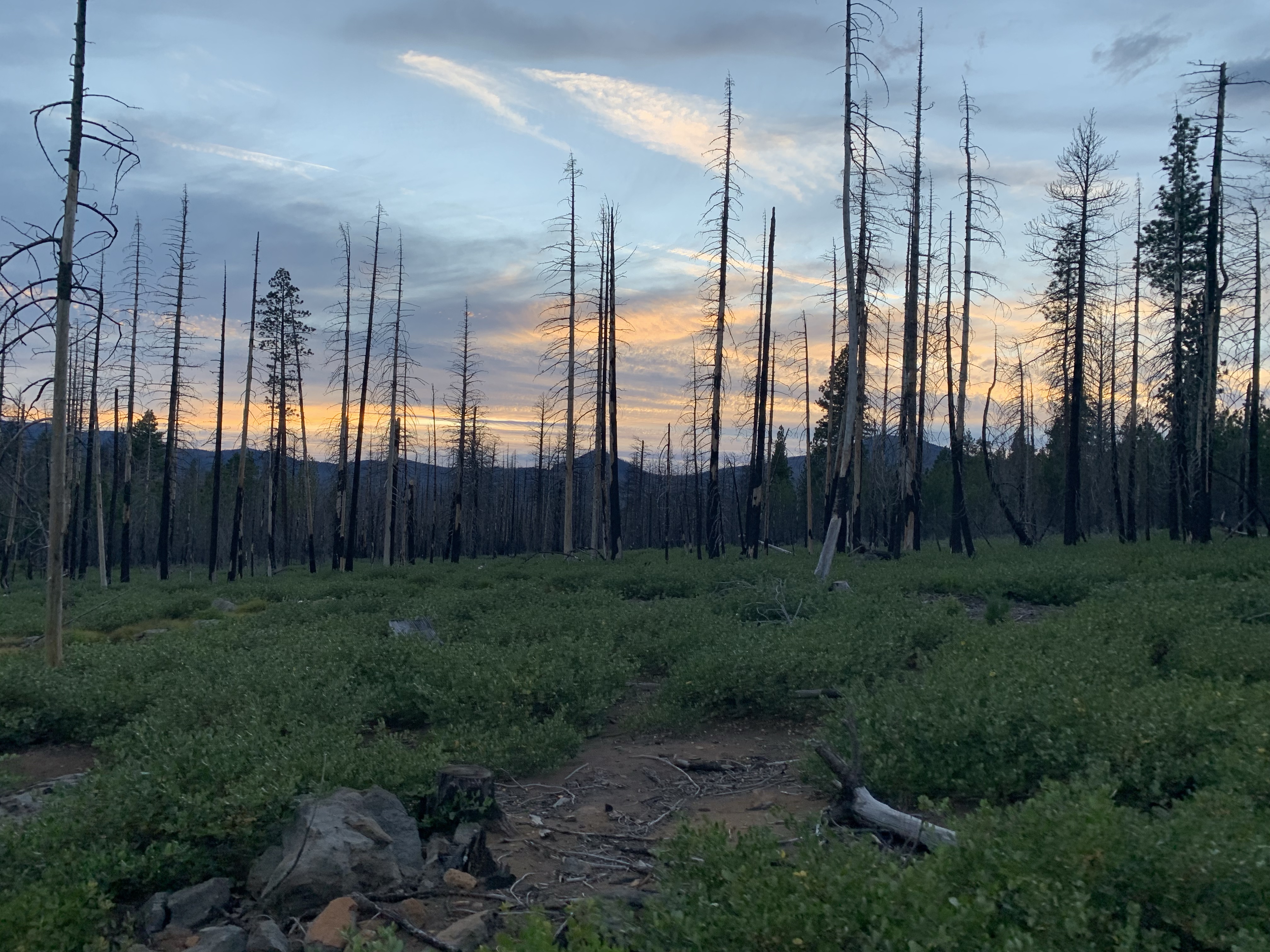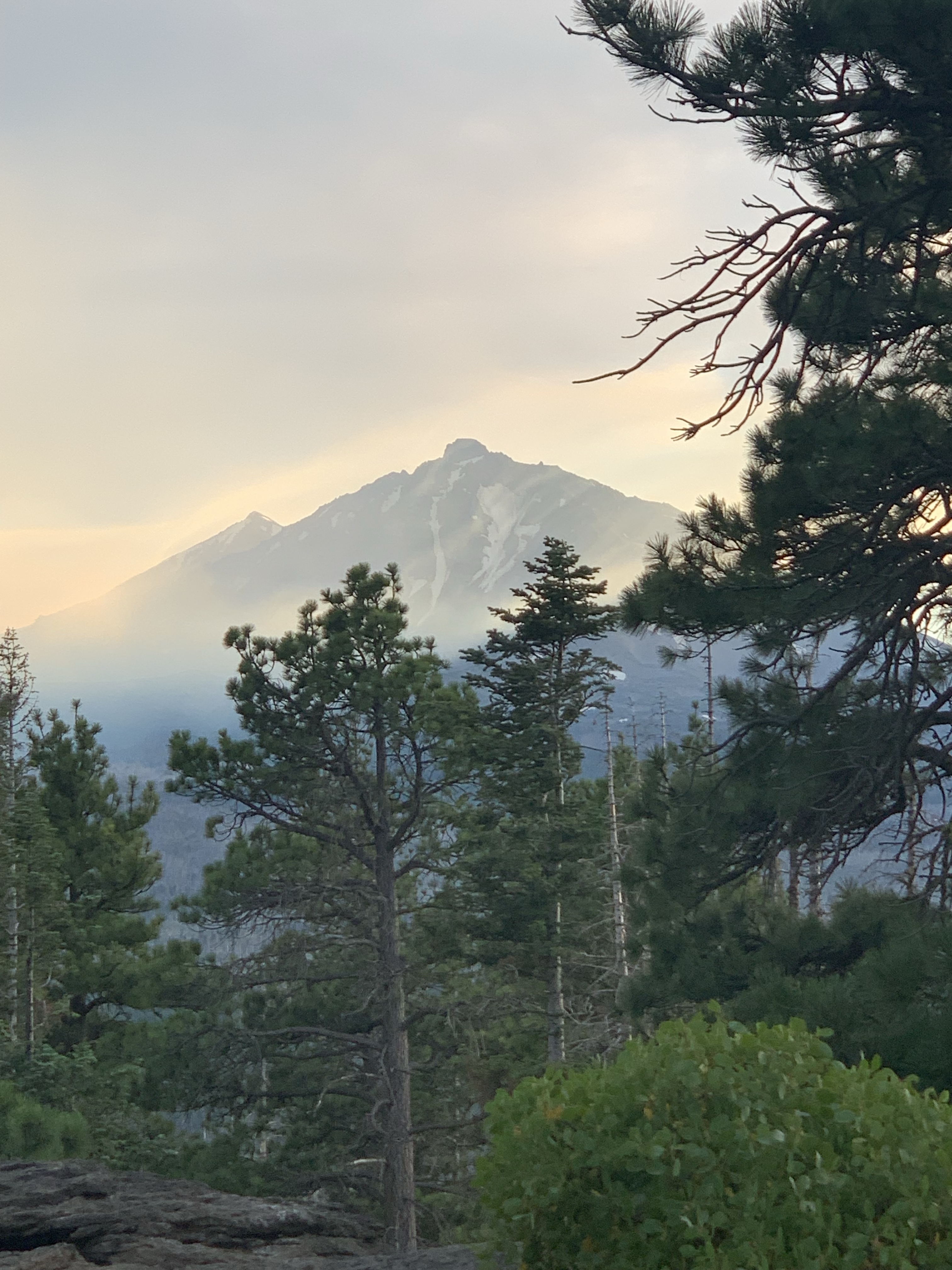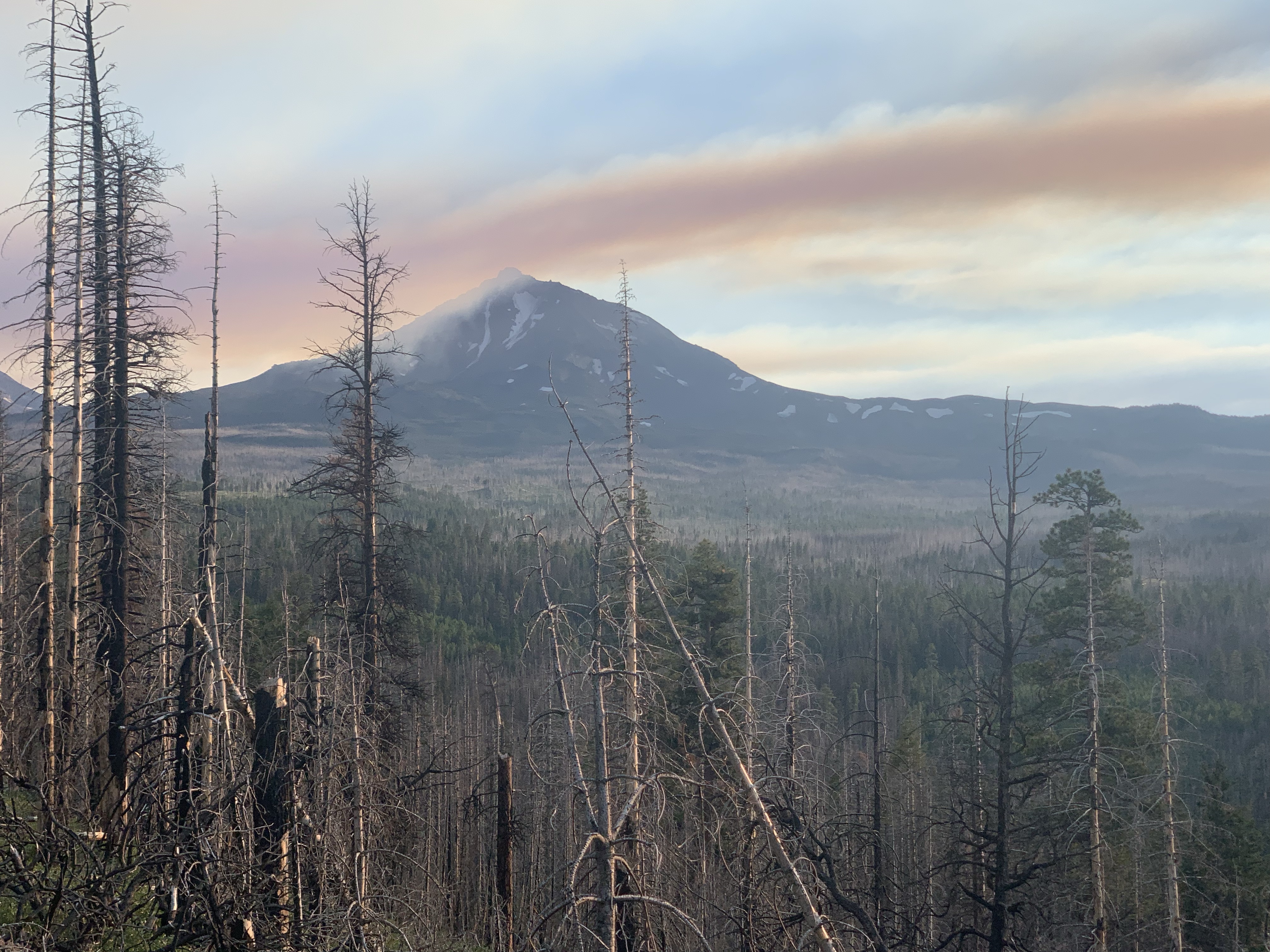 Our first day was a long ride, 19 miles by Rachel’s tracker (my Apple Watch died at mile 16). We headed up into the Three Sisters Wilderness, grabbing a free self issued wilderness permit at the Scotts Pass trailhead. About half of the trails burned but most were clear, and still had running water. One benefit to fire is it really opens up the views! I got to drink up the Three Sisters and Mt. Bachelor to the south and Black Butte and Mt. Washington to the north. We had lunch at one of the cold and clear Matthieu Lakes, Tarma standing in the lake and muching on bright green grass while Rachel hand fed my silly dog his lunch and her apple.