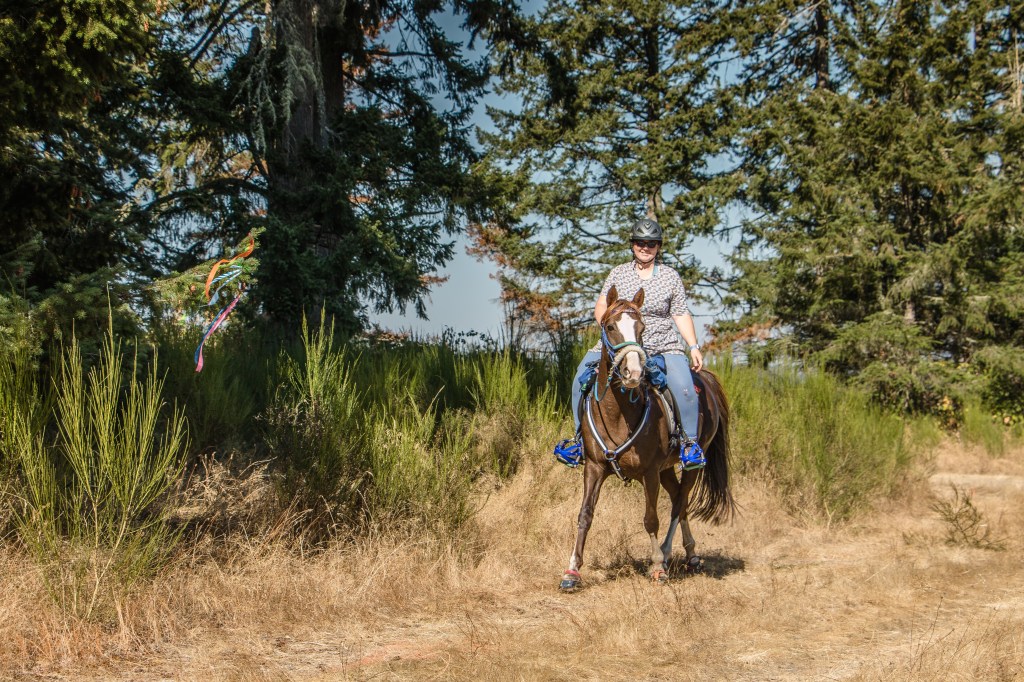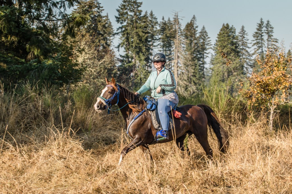Tying my Fuzzy Butts seat cover back on (it’s been off most of the summer as it’s been too hot for it to be comfortable), I turned to working through what could go wrong. Twice now Tarma has totally blown through the bridle when Cody’s been in front of us and she’s cantered up and shoved past him on trail, only to come to a halt when she chooses to a few feet in front of him. It’s not quite a true bolt, which I consider to have a measure of fear or panic driving it, but she’s definitely not stopping when I ask when the comfort gelding dares to get in front of her (it’s not every time, just when she’s feeling particularly spicy as far as I can tell). I know it’s reveling some training hole and I’m considering a bit for occasional use. At the actual ride, this is 100% where we went off the rails. Tarma locked on to a group ahead of us, and went full steam ahead. I almost had her pulled back and the reins slipped and she cantered off down a tiny, tiny incline, and off I went into some damn blackberry bushes. That I was able to hold onto the reins so she had to stick with me and I was able to climb back on and enjoy a smooth ride from there doesn’t discount the training hole.