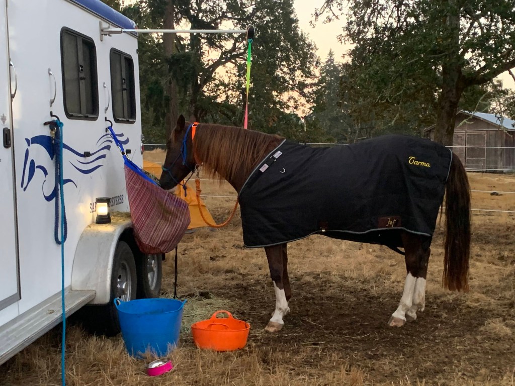 As I’m trying different attachment methods and ways to keep them off her neck and determining what needs to be in the bags for an actual endurance ride versus what can get tossed, I was thinking through the trip, the vetting in, the ride itself and the after care. I remember the tired joy of passing the final vet check, trotting up for my completion award at the rider meeting, shoving food in my face while my sweaty horse rolls and the mild anxiety of tracking their bowel movements and appetite and drinking, the concentration of fussing over them and making sure they’re comfortable after their big effort.