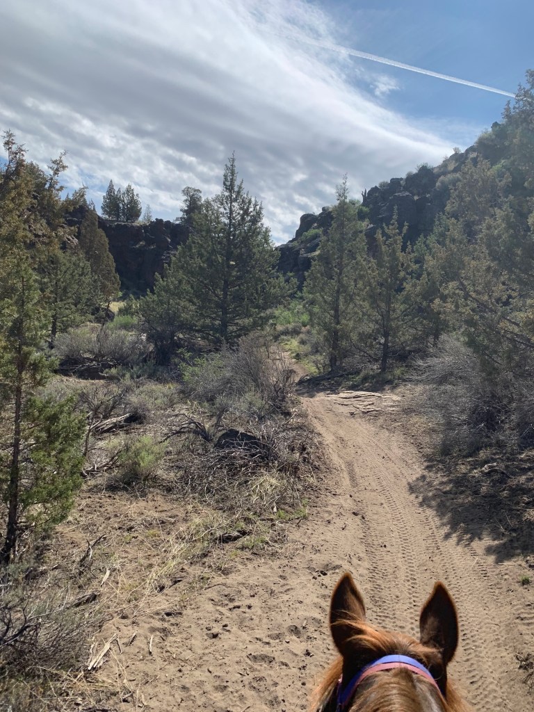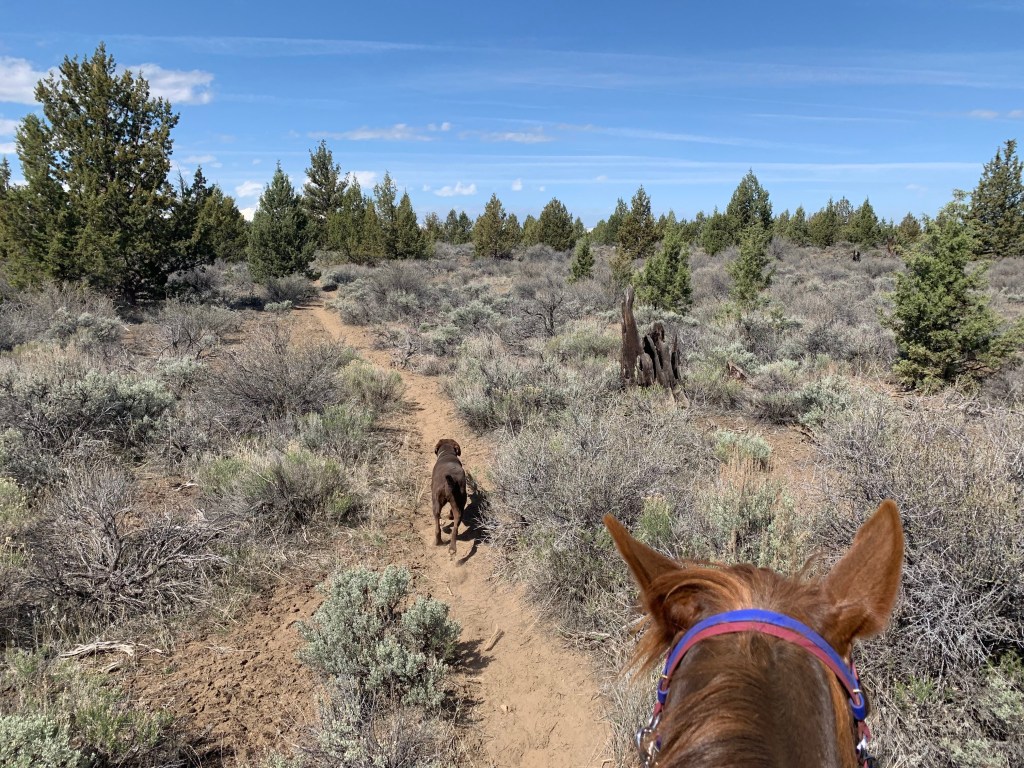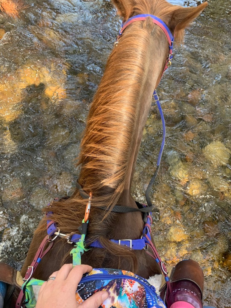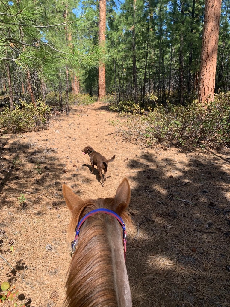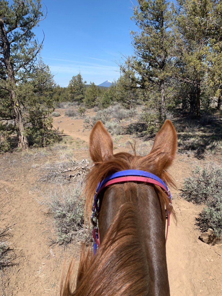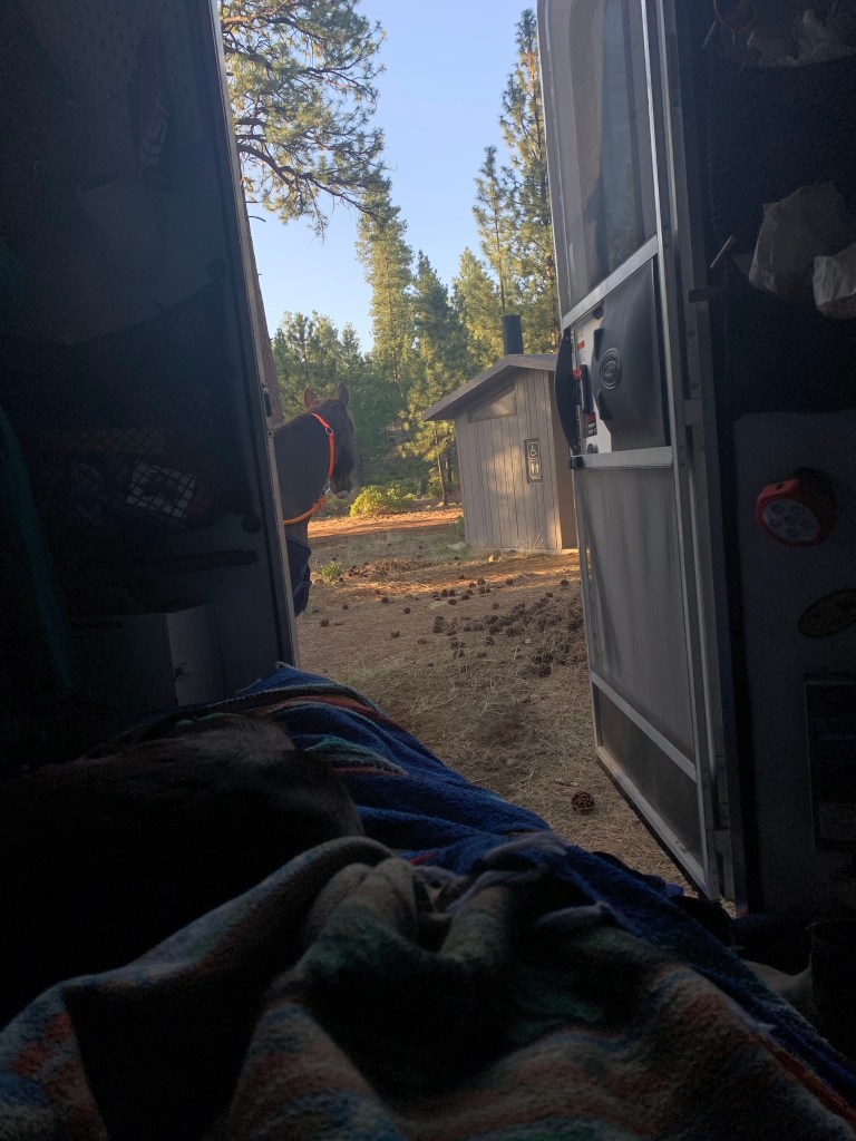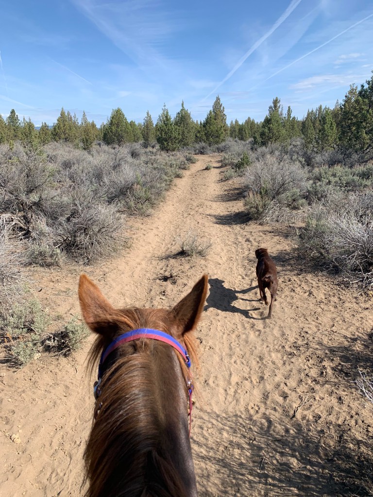 We did have a few disagreements during our camping trip to Cow Camp with a bunch of lovely folks I haven’t seen for awhile, mainly over speed. I was going for a non-endurance pace of chill and mosey, and she was going out for another race. It took several miles and parking her behind a friend’s horse at the back of the line, but she eventually got the picture…mostly. Her walk never has any mosey, so there’s a lot of halting and waiting for our friends to catch up. On our way home I stopped a trailhead I hadn’t been to for several years and Tarma’s never seen and we wandered, which she interprets my checking the map a few times to ensure we’re still more or less where we’re supposed to be as “lost in the howling wilderness”. This causes her trot to be arena slow and she keeps stopping to look behind her, convinced we’re not going the right way and she needs to take charge. The dog is oblivious to this conversation, throwing himself into dust baths while Tarma and I reach an agreement that we’re going the way I wanna go and I promise there’s food at the trailer when we get there. She’s never bolty or flighty at these moments, she’s not scared, just not entirely convinced I’m correct. I used to take this personally, and it did used to show a lack of trust, but with two years of adventures and work together under our belts I can see that it’s just Tarma, communicating with me in the space I’ve given her.
