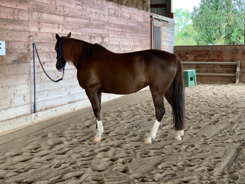 Next I tied her up while I set up one of those sneaky, deceptively simple ETS exercises: sending your horse through a pair of barrels without you, turning around on the other side, and coming back through. Easy to say, but it can be tricky for horses used to just following their person through things, and it requires precision to not bump into the barrels. We had it going pretty well from one direction, but when I switched sides Tarma got a bit sticky. As you can (hopefully) see in the video, my first attempts to send her through don’t work, she gets mentally stuck, so I had to try a few different things, including leaving the obstacle and trotting a bit to bring her energy back up. On the last try she went through so we called it a good day. I also practiced asking her to stand square each time. I have no interest in showmanship, but having a horse stand square is always useful, and it gives me another way of influencing Tarma’s feet and her decision making in a non-confrontational way.