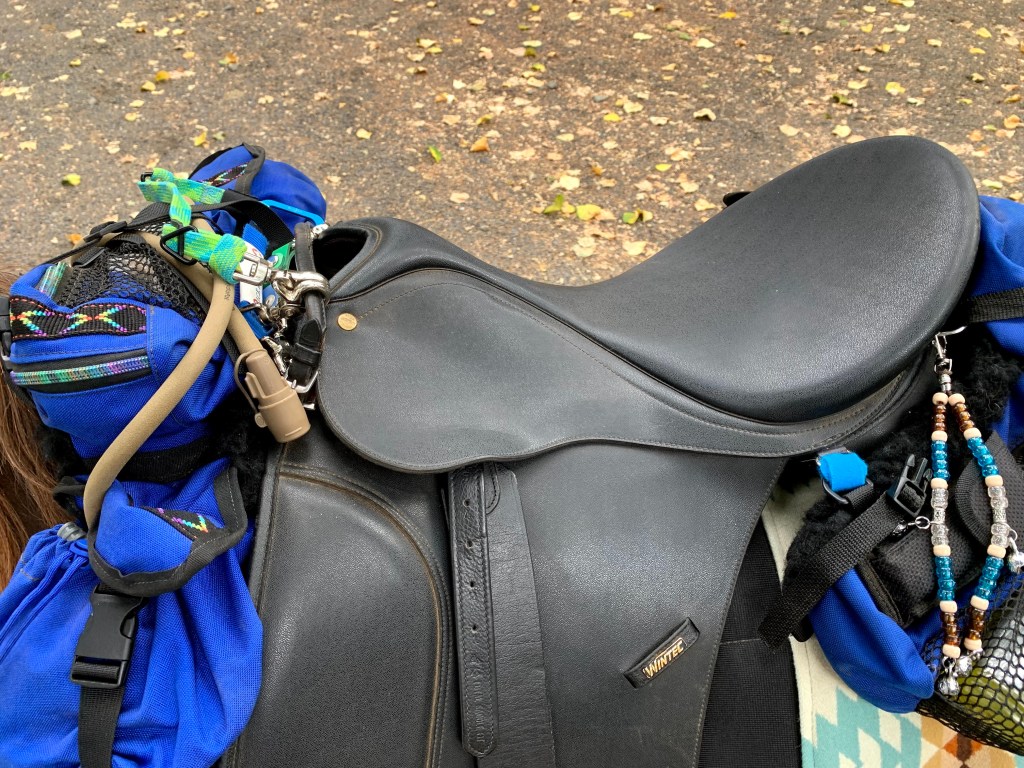 All horse folks have that horsey item they hoard too many of, and bags are my greatest weakness. I’ve been through so many saddle bags, and I’m always on the hunt for more. I’ve tried and learned I hate having a bag on me, such as a runner’s vest or thigh holster (they rub or cause too much noise). I also don’t love cantle bags as it’s hard to reach stuff and that’s where I carry my extra layers. Different activities require different set ups which means different bags. For example, arena riding or ETS events just require a treat bag, one that doesn’t need to be tied down super well as it’s not going to bounce much. Longer, slower trail rides require more space. Endurance rides, especially ones with longer than 15 mile loops or out checks, require a bag style I haven’t purchased yet, especially that give me the ability to neatly carry electrolyte tubes (none of my current bags allow for this). My current Synergist saddle came with lovely leather bottle holders, so those paired with a small pommel bag got me through this endurance season, though without space for electrolytes. I usually end up with a separate bag off the cantle for my space boot, something I’ve learned to never go without.