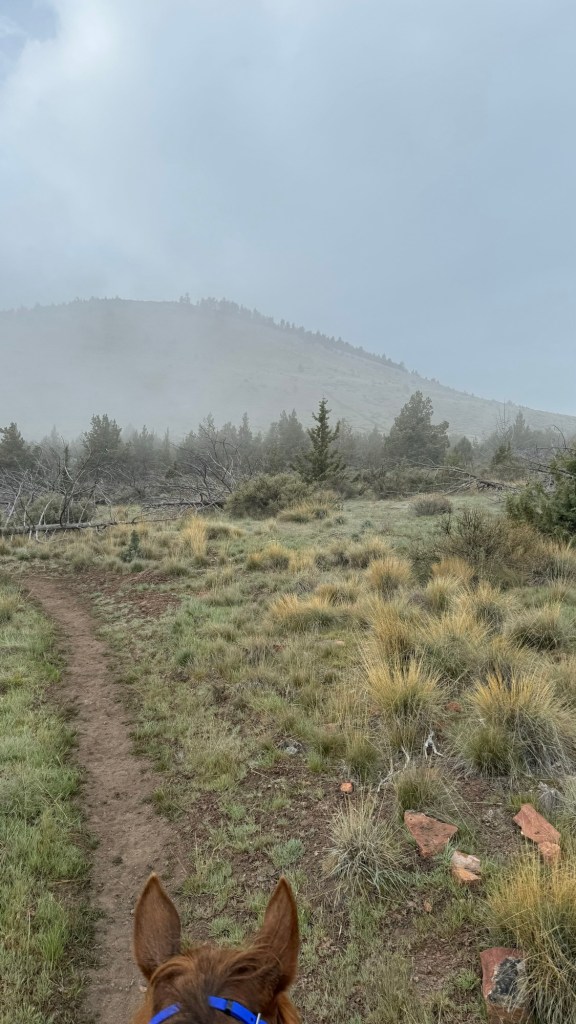 We managed a few more trot sets on our way down the butte and back towards camp, but once past the ride photographer we pretty much walked the four miles or so back. We had plenty of time and I was getting tight, and I had once again forgotten to rub the anti chafe butter under my bra strap so they were rough again. It had also started to mist, enough to cool us off but not put my riding skirt on. I have her one last dose of elytes two miles out of camp and we grazed our way down a weirdly green grass fence line and moseyed into camp. Tarma immediately pulsed down and vetted through, receiving plenty of compliments while Kade trotted her out for me.