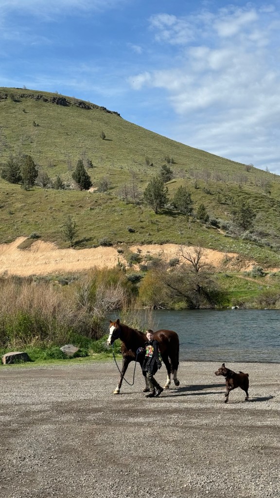 I was at my happiest today in a gravel parking lot. We were in our way home from a fantastic weekend at the Grizzly Mountain Ride, and we’d stopped at the rest area on the Deschutes River in Warm Springs. This area is my favorite of all my road trips, I swear there’s magic in the smoothly rushing water, the always green grass and the mustangs on the other side. Today we’d stopped so I could soak the awful mud off Tarma’s legs, she charged right into the river and munched as I drank my coffee in the sunshine and Kade threw a stick for Benny, happily swimming into the river like an otter.
