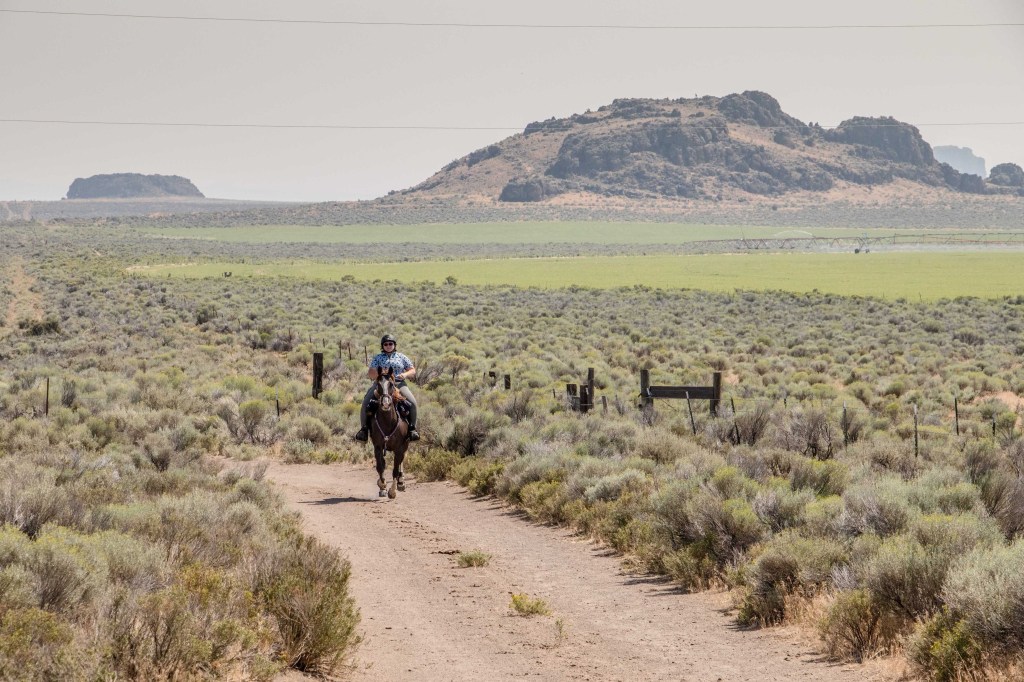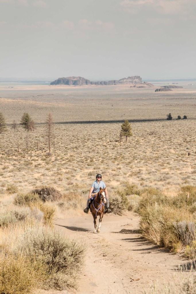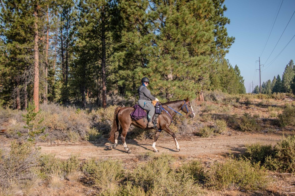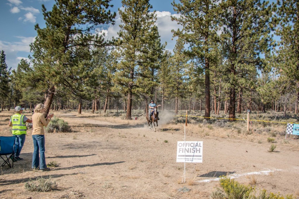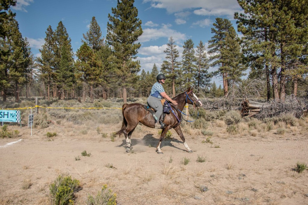 We rolled in Thursday afternoon and tucked ourselves in the back, far away from the hustle and bustle and right next to some friends who were volunteering. Setting up two horses on their Hi-ties takes no time at all with Kade’s help, and I was able to vet Tarma in with no trouble. I blanketed her in anticipation of a slightly chilly night, then went hunting down the blood machine (forgot to get her after ride blood draw, dangit!) and a clipper to stencil a crown onto her butt (which I absolutely adore!) I missed a bit of socializing as I don’t drink or stay up late the night before a ride, alas. I also was one blanket too short to be fully comfortable (high desert in August is still chilly), so I didn’t sleep the best even with my Labradork heater. I also had to get up a bit earlier than usual to wrestle Tarma’s boots on, and I remembered why I’ve been shelling out for composite shoes as it took me a good 25 minutes to get them set just right…and she still rubbed her front heel bulbs (Regular Scoots, so I might switch her to EasyBoot Gloves all around, because the Gloves on her rears didn’t budge or rub even a tiny bit, even though they are a pain in the ass to ensure they are on correctly at 5 in the morning!) Once I had stuffed cold brew, a banana, yogurt and Excedrin down my gullet, we were ready to rock. I took a chance that almost went sideways, I both mounted in camp to start and wore my warmer Artic Skirt, as it was pretty chilly! After riding calmly out of camp on LDs all season, Tarma decided to be almost too spicy but I breathed deep and lectured her, so while we went slightly sideways out of camp we did so with no airs above ground. Jala did catch some lovely photos of us heading out with my skirt on!