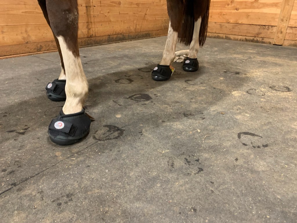 - EasyCare recently came out with the Ones with mushroom cuffs (applied with Super Glue), which in theory you leave the cuffs on and only put the shoes on when you ride, so they can be barefoot in pasture. To me this is the perfect solution, if I can get it to work. My first application was hot garbage, and I was able to pry two cuffs off the next day only with my questionable hand strength (two cuffs are already lost in the pasture). However, I didn’t really follow all the prep steps, especially about roughing the hoof wall to give the Super Glue space to adhere to. I also measured not quite right so the fronts are too small, so I ordered a new set and I’m going to try, try, try again, this time following every single step to the letter. If this doesn’t work, I’m going to try to find a professional to pop them on, and if that doesn’t work I’ll just lay in a hole in the ground and cry, because due to her injury she can’t wear front boots for months at least.